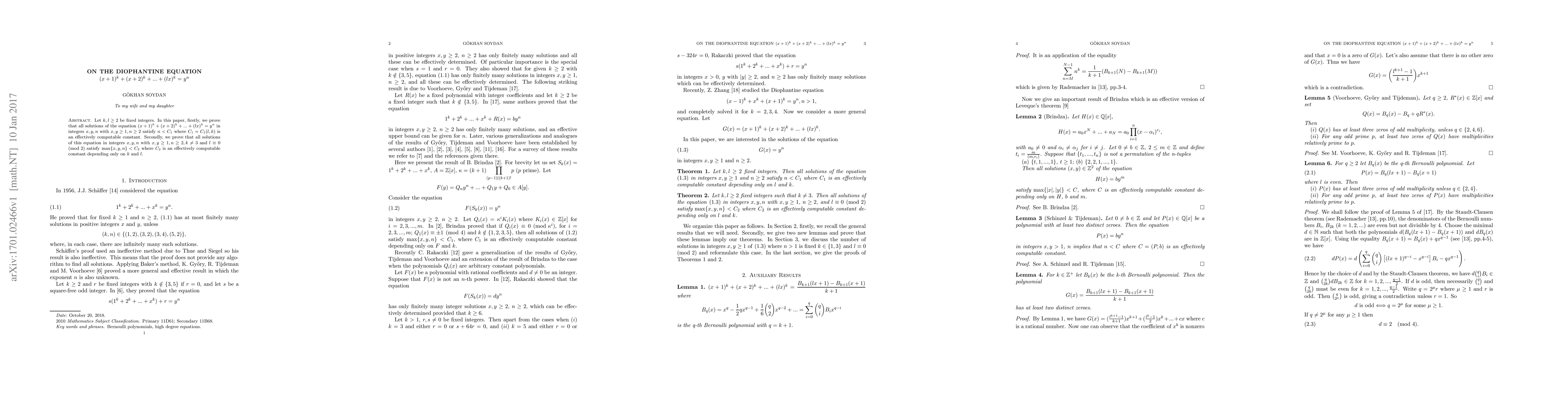This paper proves bounds for integer solutions of the Diophantine equation $(x+1)^{k}+(x+2)^{k}+...+(lx)^{k}=y^{n}$, showing that $n<C_{1}$ for any solution with $x,y\geq1$ and $n\geq2$, where $C_{1}$ is a computable constant. Additionally, for $k\neq3$ and $l\equiv0 \pmod 2$, it establishes $\max\{x,y,n\}<C_{2}$ with $C_{2}$ depending on $k$ and $l$.