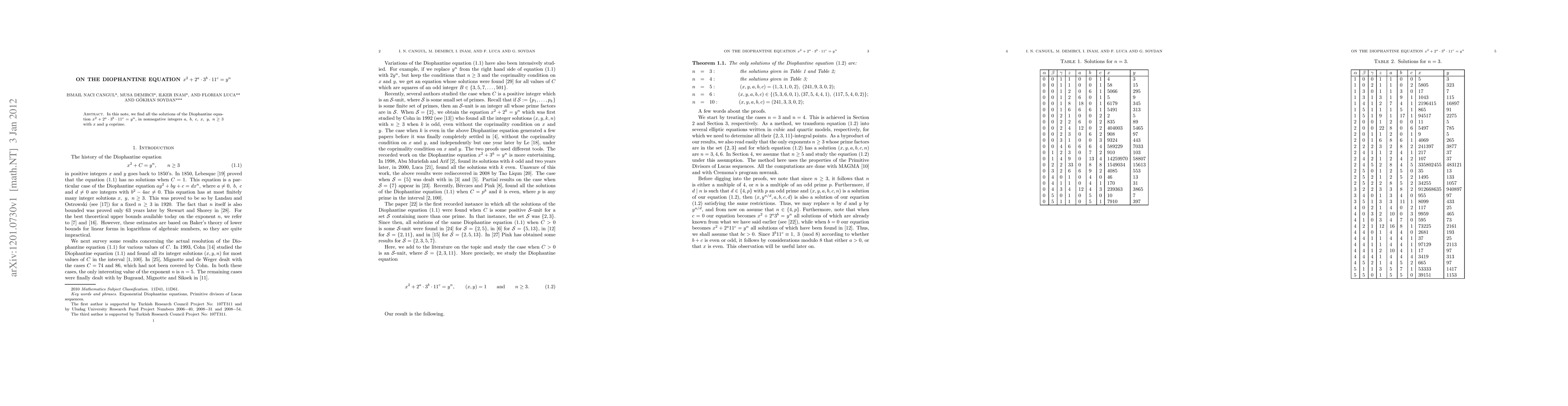 This paper identifies all nonnegative integer solutions to the Diophantine equation \(x^2 + 2^a \cdot 3^b \cdot 11^c = y^n\) where \(x\) and \(y\) are coprime and \(n \geq 3\). The study reveals specific constraints and conditions under which the equation holds true.