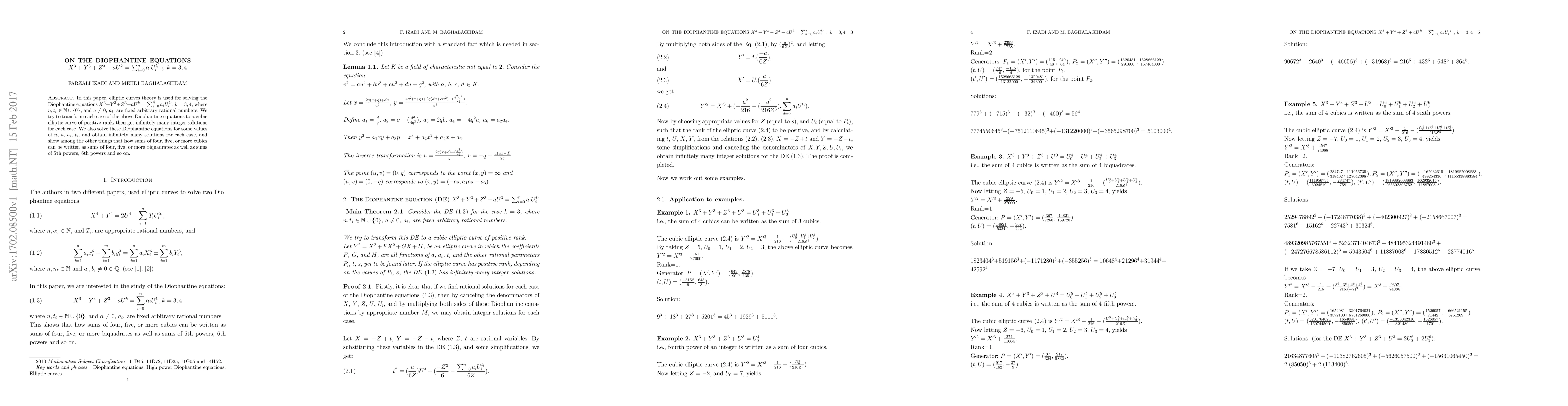 This paper utilizes elliptic curve theory to solve Diophantine equations of the form X^3+Y^3+Z^3+aU^k=a_0U_0^{t_0}+...+a_nU_n^{t_n} for k=3,4, demonstrating the transformation of these equations into cubic elliptic curves of positive rank to derive infinitely many integer solutions.