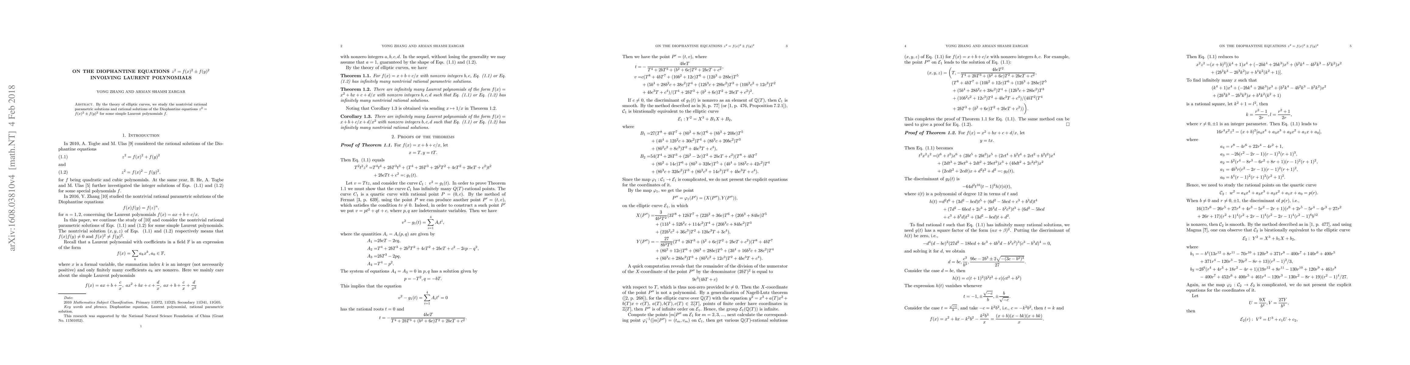 By the theory of elliptic curves, we study the nontrivial rational parametric solutions and rational solutions of the Diophantine equations $z^2=f(x)^2 \pm f(y)^2$ for some simple Laurent polynomials $f$.