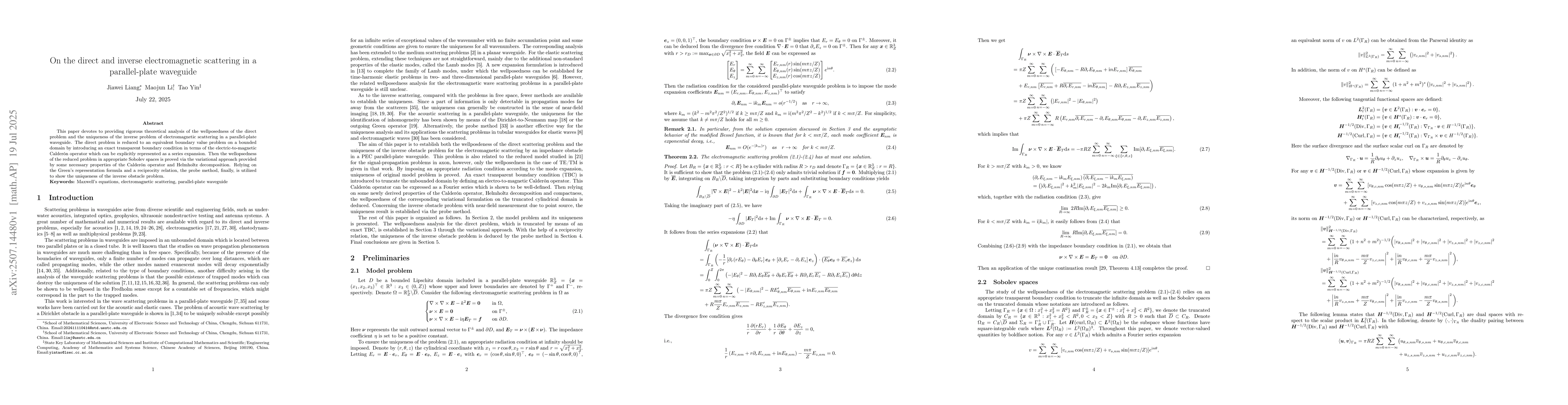 This paper devotes to providing rigorous theoretical analysis of the wellposedness of the direct problem and the uniqueness of the inverse problem of electromagnetic scattering in a parallel-plate waveguide. The direct problem is reduced to an equivalent boundary value problem on a bounded domain by introducing an exact transparent boundary condition in terms of the electric-to-magnetic Calder\'on operator which can be explicitly represented as a series expansion. Then the wellopsedness of the reduced problem in appropriate Sobolev spaces is proved via the variational approach provided by some necessary properties of the Calder\'on operator and Helmholtz decomposition. Relying on the Green's representation formula and a reciprocity relation, the probe method, finally, is utilized to show the uniqueness of the inverse obstacle problem.