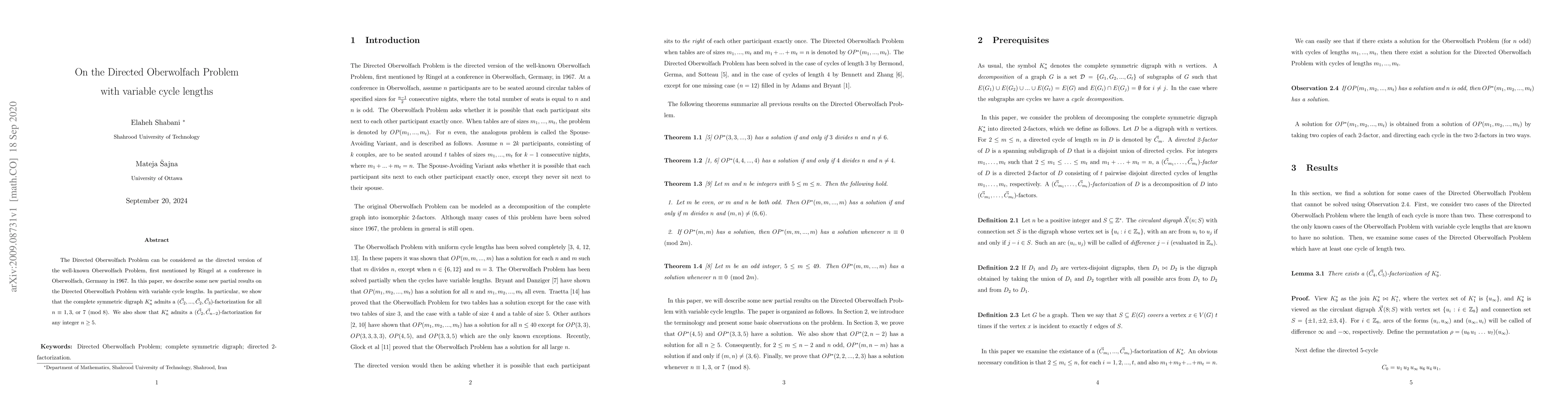 The Directed Oberwolfach Problem can be considered as the directed version of the well-known Oberwolfach Problem, first mentioned by Ringel at a conference in Oberwolfach, Germany in 1967. In this paper, we describe some new partial results on the Directed Oberwolfach Problem with variable cycle lengths. In particular, we show that the complete symmetric digraph $K_n^{*}$ admits a $( \vec{C}_2, ..., \vec{C}_2, \vec{C}_3) $-factorization for all $ n\equiv 1, 3,$ or $ 7\pmod{8}$. We also show that $K_n^{*}$ admits a $(\vec{C}_2, \vec{C}_{n-2})$-factorization for any integer $n \geq 5$.