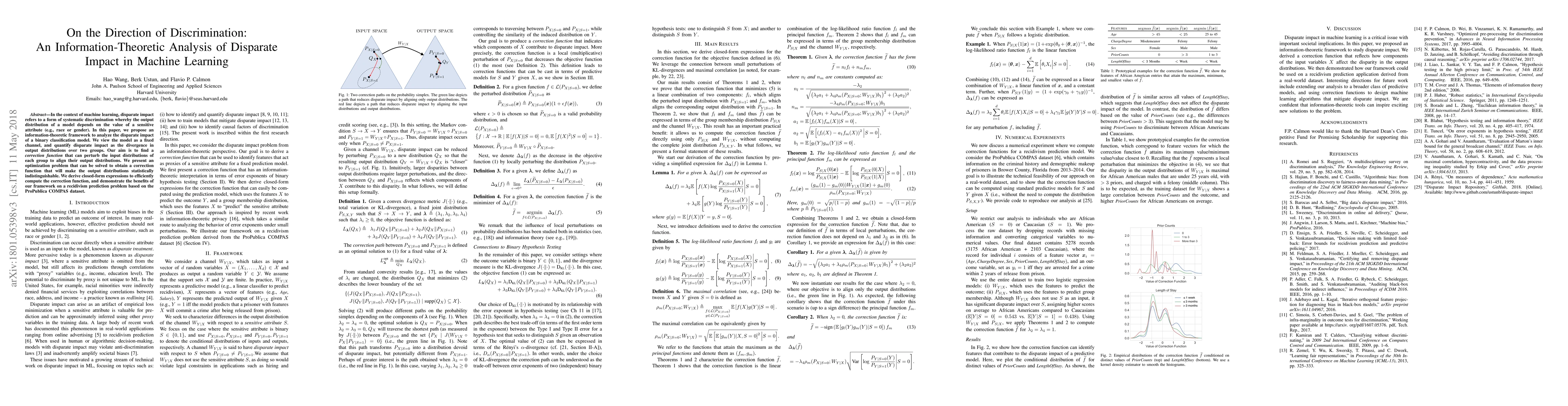 In the context of machine learning, disparate impact refers to a form of systematic discrimination whereby the output distribution of a model depends on the value of a sensitive attribute (e.g., race or gender). In this paper, we propose an information-theoretic framework to analyze the disparate impact of a binary classification model. We view the model as a fixed channel, and quantify disparate impact as the divergence in output distributions over two groups. Our aim is to find a correction function that can perturb the input distributions of each group to align their output distributions. We present an optimization problem that can be solved to obtain a correction function that will make the output distributions statistically indistinguishable. We derive closed-form expressions to efficiently compute the correction function, and demonstrate the benefits of our framework on a recidivism prediction problem based on the ProPublica COMPAS dataset.