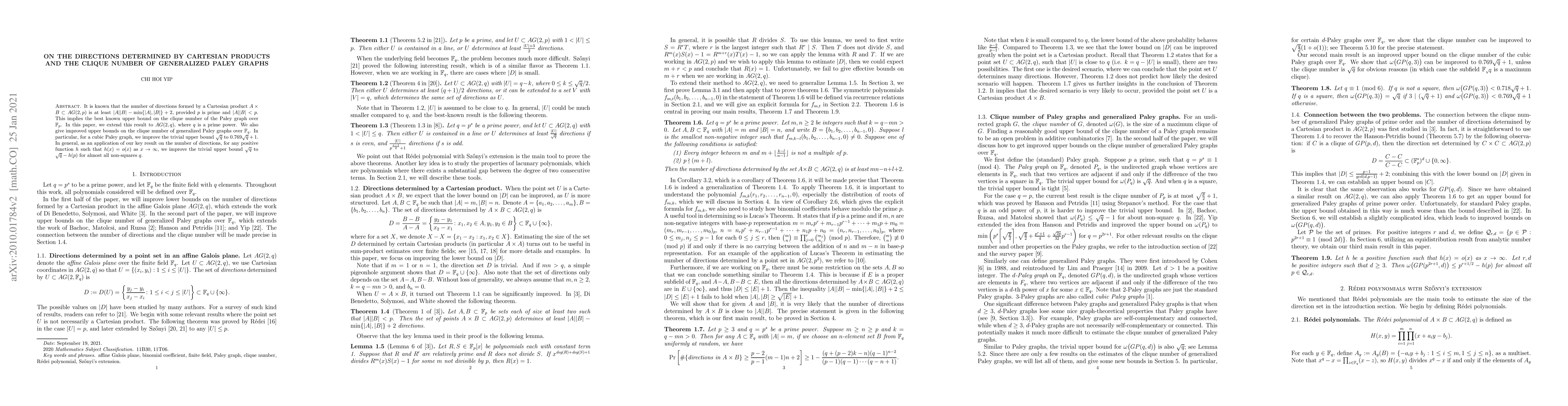 This paper extends the known result on the number of directions in Cartesian products to $AG(2,q)$ for prime powers $q$, providing improved upper bounds on the clique number of generalized Paley graphs. Specifically, for cubic Paley graphs, the upper bound is enhanced from $\sqrt{q}$ to $0.769\sqrt{q}+1$.