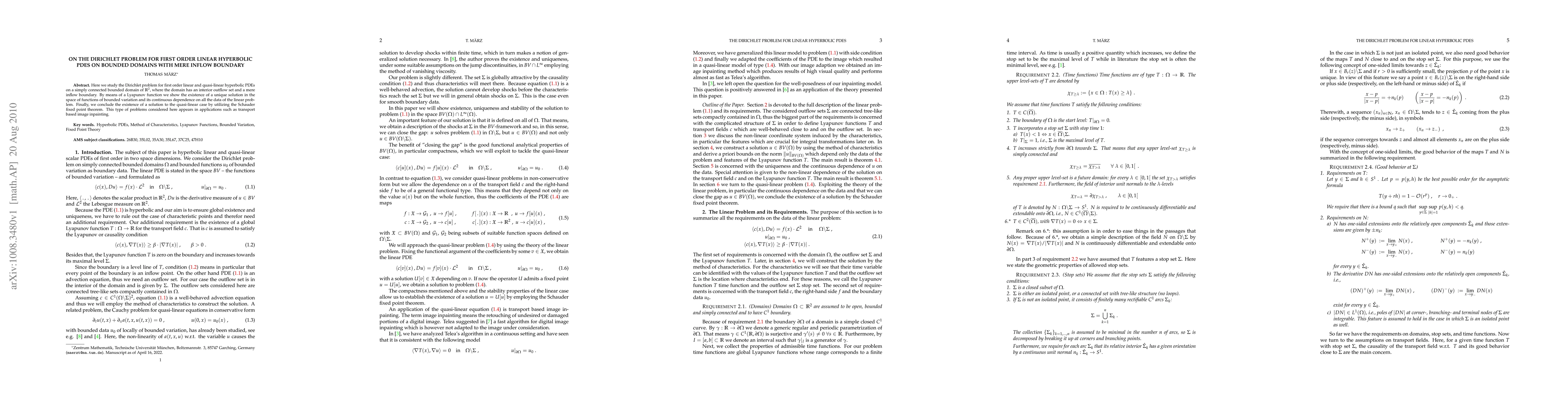 Here we study the Dirichlet problem for first order linear and quasi-linear hyperbolic PDEs on a simply connected bounded domain of $\R^2$, where the domain has an interior outflow set and a mere inflow boundary. By means of a Lyapunov function we show the existence of a unique solution in the space of functions of bounded variation and its continuous dependence on all the data of the linear problem. Finally, we conclude the existence of a solution to the quasi-linear case by utilizing the Schauder fixed point theorem. This type of problems considered here appears in applications such as transport based image inpainting.