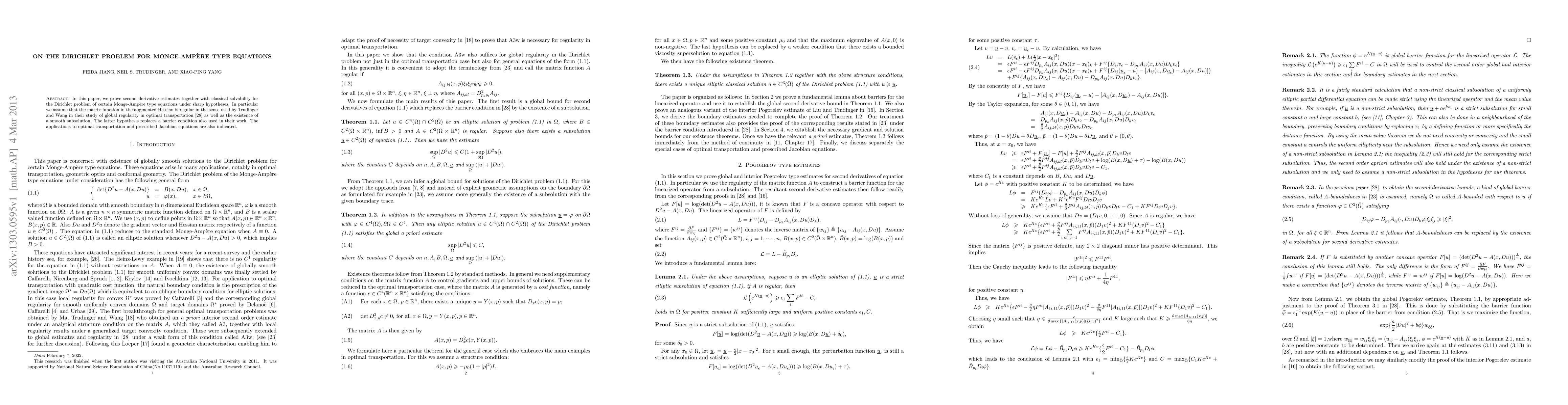 This paper proves second derivative estimates and classical solvability for the Dirichlet problem of Monge-Ampere type equations under specific hypotheses, including regularity of the matrix function and existence of a smooth subsolution, with applications to optimal transportation and prescribed Jacobian equations.