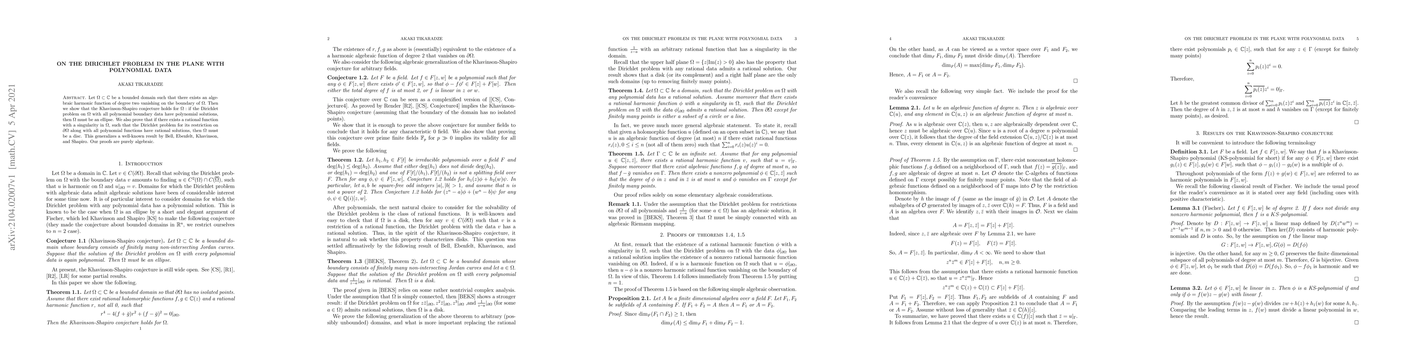 The paper proves that for a bounded domain Émpty in the plane with polynomial data, if the Dirichlet problem has polynomial solutions, then Émptly must be an ellipse. If rational solutions exist, then Émptly is a disc.