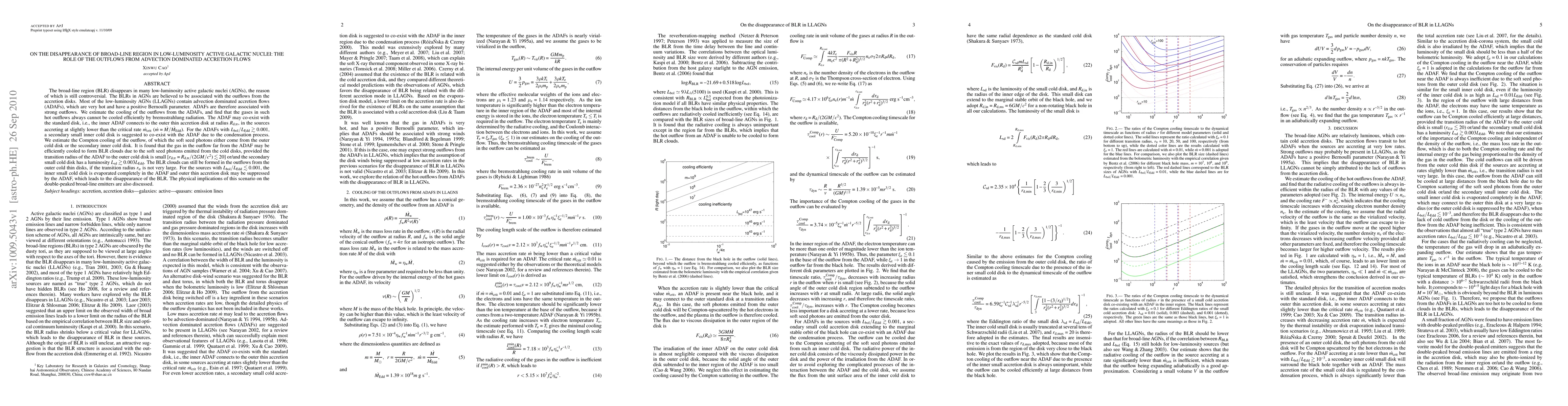 The broad-line region (BLR) disappears in many low-luminosity AGNs, the reason of which is still controversial. The BLRs in AGNs are believed to be associated with the outflows from the accretion disks. Most of the low-luminosity AGNs (LLAGNs) contain advection dominated accretion flows (ADAFs), which are very hot and have a positive Bernoulli parameter. ADAFs are therefore associated with strong outflows. We estimate the cooling of the outflows from the ADAFs, and find that the gases in such hot outflows always cannot be cooled efficiently by bremsstrahlung radiation. The ADAF may co-exist with the standard disk, i.e., the inner ADAF connects to the outer thin accretion disk at radius R_tr, in the sources accreting at slightly lower than the critical rate. For the ADAFs with >0.001 L_edd, a secondary small inner cold disk is suggested to co-exist with the ADAF due to the condensation process. We estimate the Compton cooling of the outflow, of which the soft seed photons either come from the outer cold disk or the secondary inner cold disk. It is found that the gas in the outflow far from the ADAF may be efficiently cooled to form BLR clouds due to the soft seed photons emitted from the cold disks, provided the transition radius of the ADAF to the outer cold disk is small or/and the secondary small cold disk has a luminosity >0.003L_edd. The BLR clouds can still be formed in the outflows from the outer cold thin disks, if the transition radius is not very large. For the sources with <0.001L_edd, the inner small cold disk is evaporated completely in the ADAF and outer thin accretion disk may be suppressed by the ADAF, which leads to the disappearance of the BLR. The physical implications of this scenario on the double-peaked broad-line emitters are also discussed.