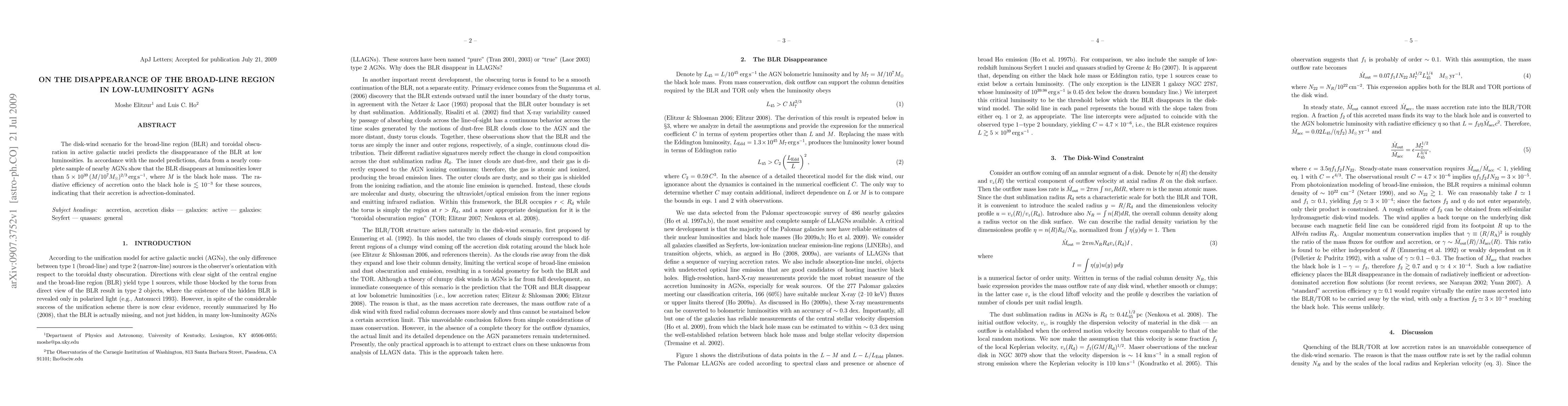 The disk-wind scenario for the broad-line region (BLR) and toroidal obscuration in active galactic nuclei predicts the disappearance of the BLR at low luminosities. In accordance with the model predictions, data from a nearly complete sample of nearby AGNs show that the BLR disappears at luminosities lower than $5\times\E{39} (M/10^7\Mo)^{2/3}$ erg s$^{-1)$, where $M$ is the black hole mass. The radiative efficiency of accretion onto the black hole is $\la \E{-3}$ for these sources, indicating that their accretion is advection-dominated.