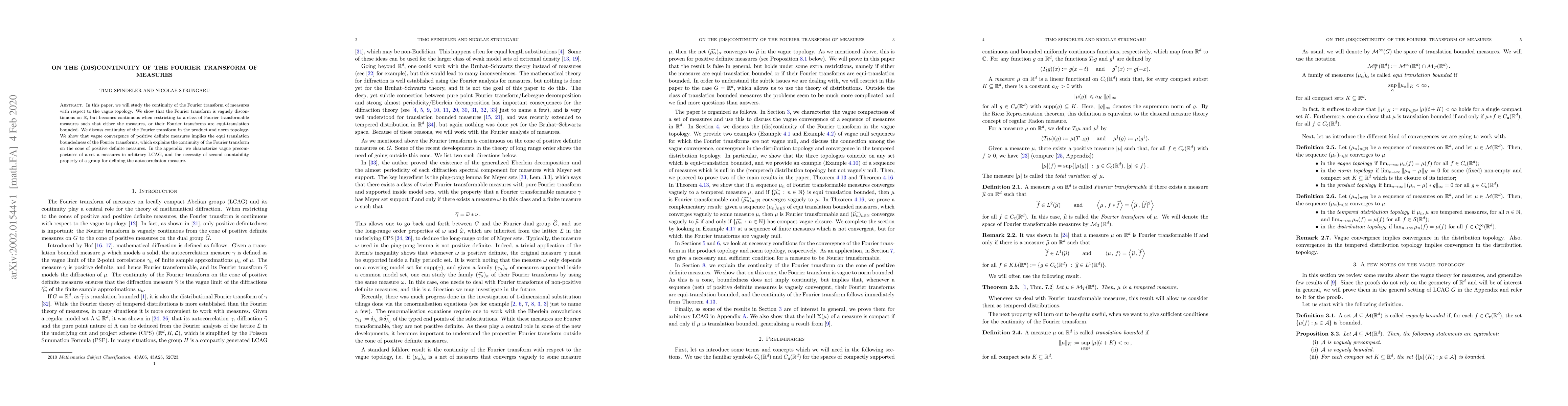 In this paper, we will study the continuity of the Fourier transform of measures with respect to the vague topology. We show that the Fourier transform is vaguely discontinuous on R, but becomes continuous when restricting to a class of Fourier transformable measures such that either the measures, or their Fourier transforms are equi-translation bounded. We discuss continuity of the Fourier transform in the product and norm topology. We show that vague convergence of positive definite measures implies the equi translation boundedness of the Fourier transforms, which explains the continuity of the Fourier transform on the cone of positive definite measures. In the appendix, we characterize vague precompactness of a set a measures in arbitrary LCAG, and the necessity of second countability property of a group for defining the autocorrelation measure.