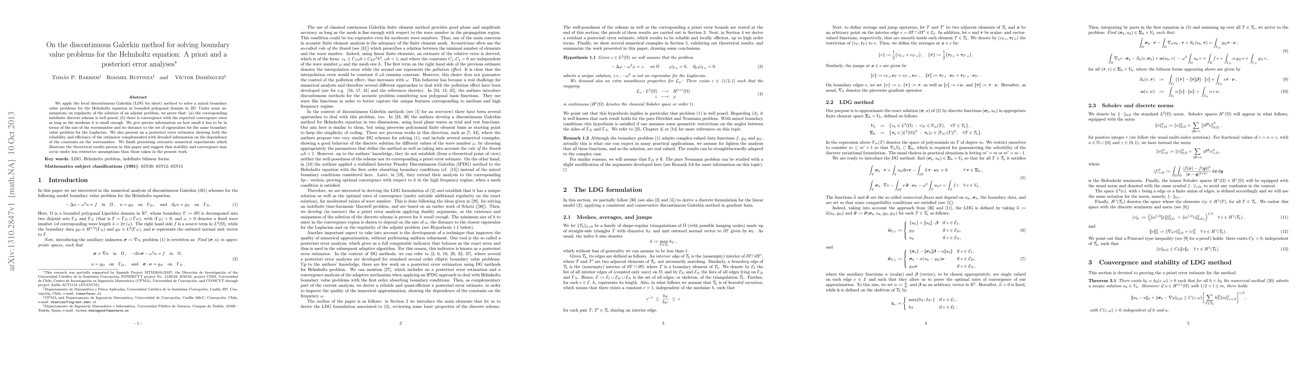 This paper applies the local discontinuous Galerkin (LDG) method to solve mixed boundary value problems for the Helmholtz equation in 2D polygonal domains, proving well-posedness and convergence with expected rates under certain regularity assumptions. It also introduces an a posteriori error estimator and supports theoretical findings with numerical experiments.