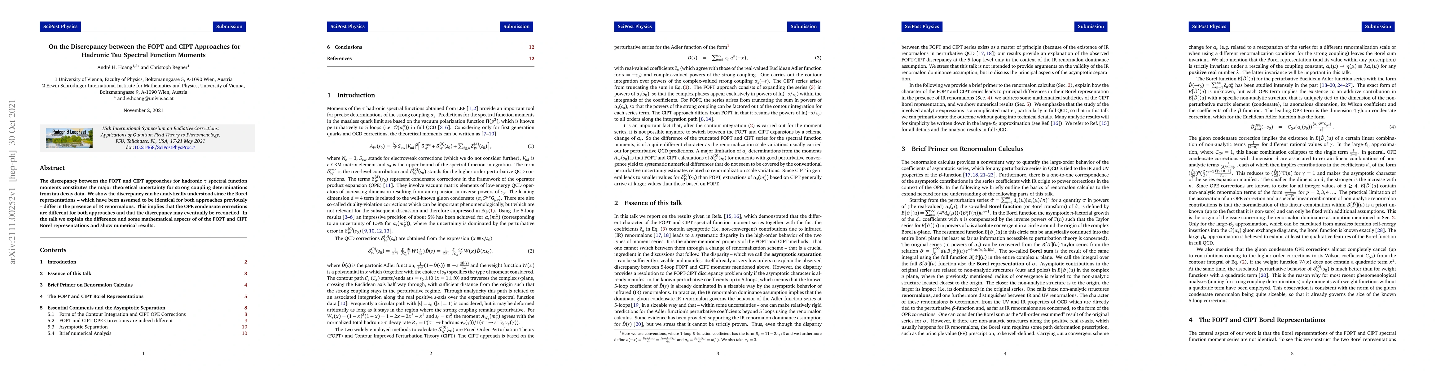 This paper identifies the discrepancy between FOPT (First Order Perturbation Theory) and CIPT (Conformal Interpretation of Perturbation Theory) approaches for hadronic tau spectral function moments as stemming from differing Borel representations due to IR renormalons. The findings suggest that the OPE (Operator Product Expansion) condensate corrections vary for both methods, potentially reconcilable through understanding these differences.
