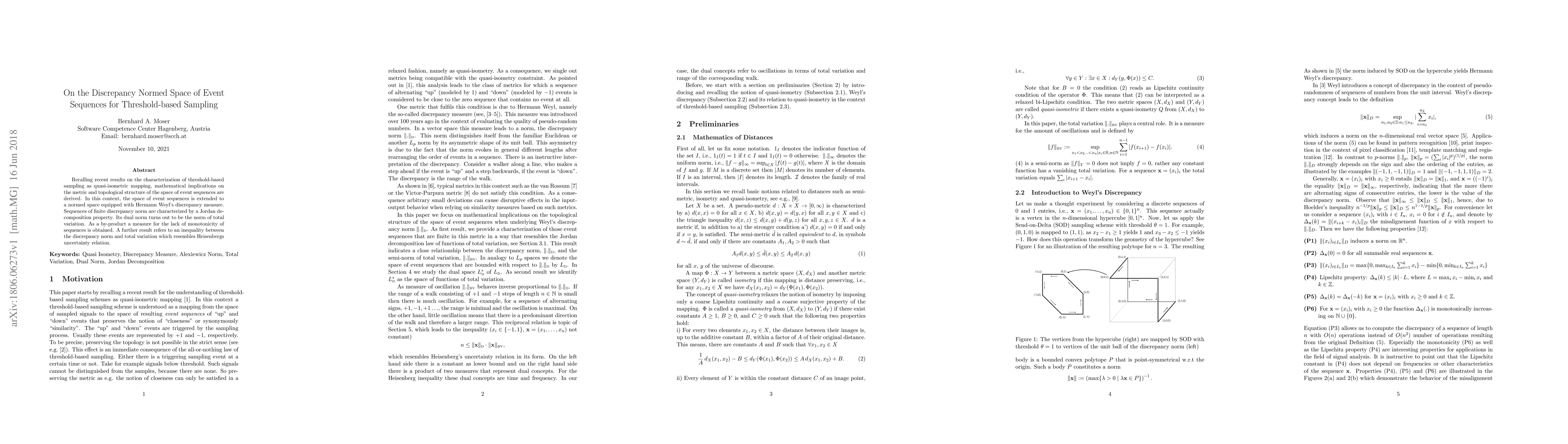 Recalling recent results on the characterization of threshold-based sampling as quasi-isometric mapping, mathematical implications on the metric and topological structure of the space of event sequences are derived. In this context, the space of event sequences is extended to a normed space equipped with Hermann Weyl's discrepancy measure. Sequences of finite discrepancy norm are characterized by a Jordan decomposition property. Its dual norm turns out to be the norm of total variation. As a by-product a measure for the lack of monotonicity of sequences is obtained. A further result refers to an inequality between the discrepancy norm and total variation which resembles Heisenberg's uncertainty relation.