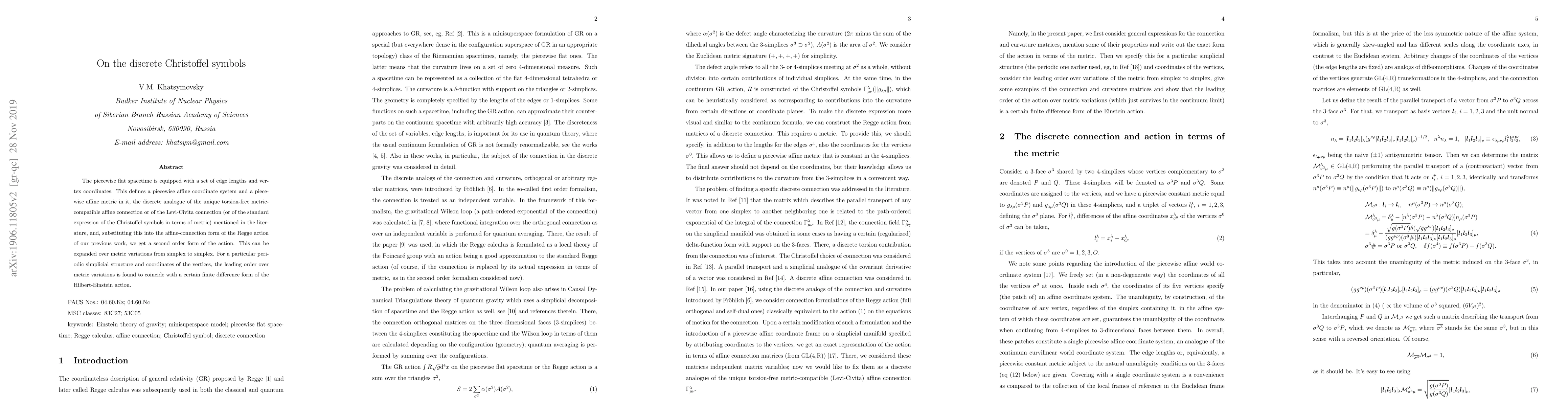 The piecewise flat spacetime is equipped with a set of edge lengths and vertex coordinates. This defines a piecewise affine coordinate system and a piecewise affine metric in it, the discrete analogue of the unique torsion-free metric-compatible affine connection or of the Levi-Civita connection (or of the standard expression of the Christoffel symbols in terms of metric) mentioned in the literature, and, substituting this into the affine-connection form of the Regge action of our previous work, we get a second order form of the action. This can be expanded over metric variations from simplex to simplex. For a particular periodic simplicial structure and coordinates of the vertices, the leading order over metric variations is found to coincide with a certain finite difference form of the Hilbert-Einstein action.