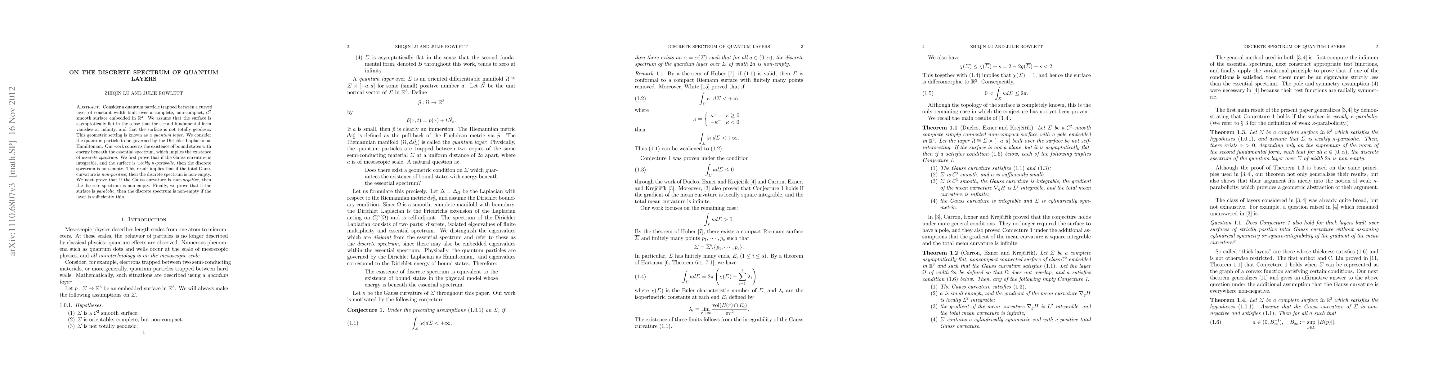 This paper investigates the discrete spectrum of a quantum particle in a quantum layer—a curved layer of constant width embedded in $\mathbb{R}^3$. It proves the existence of non-empty discrete spectrum under various conditions on the Gauss curvature and the layer's thickness.