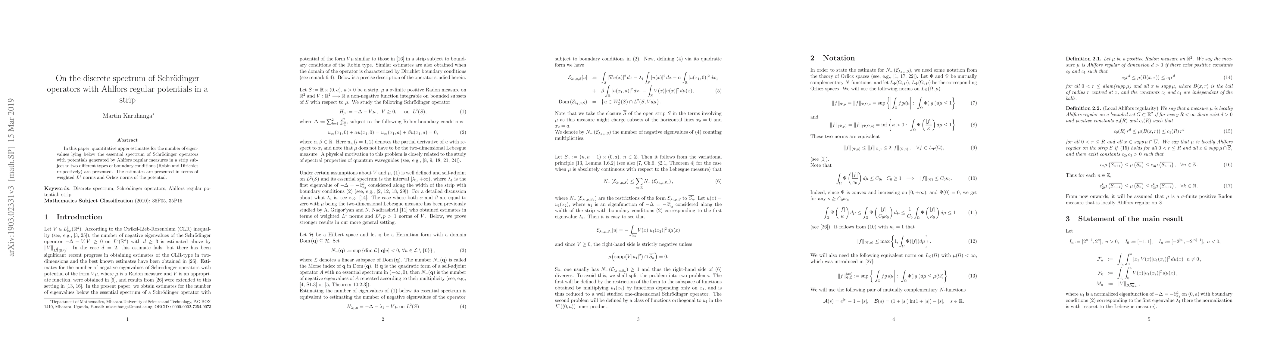 In this paper, quantitative upper estimates for the number of eigenvalues lying below the essential spectrum of Schroedinger operators with potentials generated by Ahlfors regular measures in a strip subject to two different types of boundary conditions (Robin and Dirichlet respectively) are presented. The estimates are presented in terms of weighted L^1 norms and Orlicz norms of the potential.