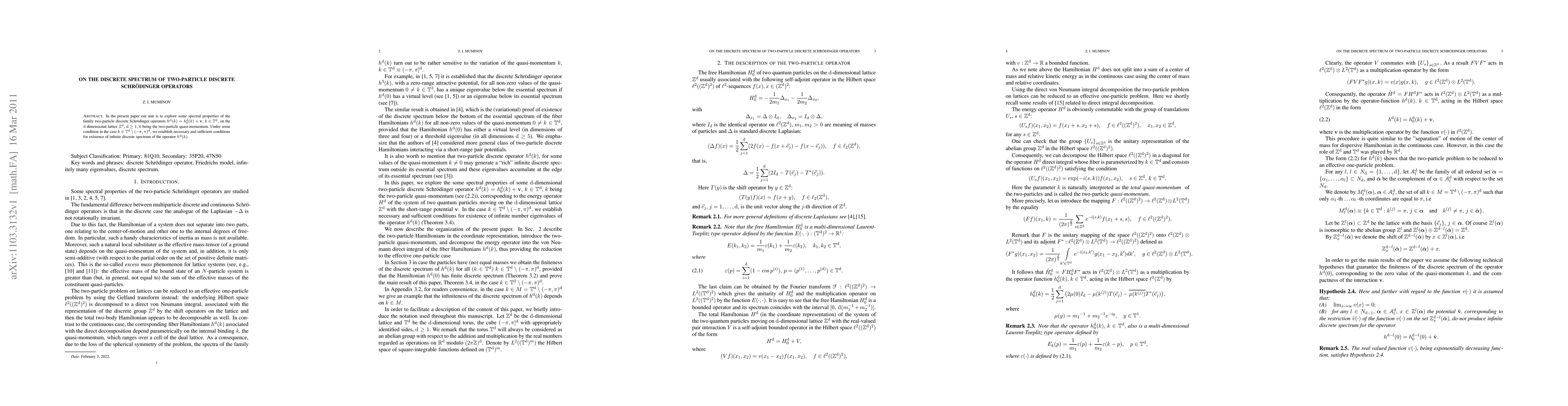 In the present paper our aim is to explore some spectral properties of the family two-particle discrete Schr\"odinger operators $h^{\mathrm{d}}(k)=h^{\mathrm{d}}_0(k)+ \mathbf{v},$ $k\in \T^\mathrm{d},$ on the $\mathrm{d}$ dimensional lattice $\Z^{\mathrm{d}},$ $\mathrm{d}\geq 1,$ $k$ being the two-particle quasi-momentum. Under some condition in the case $k\in \T^{\mathrm{d}}\setminus (-\pi,\pi)^{\mathrm{d}},$ we establish necessary and sufficient conditions for existence of infinite discrete spectrum of the operator $h^{\mathrm{d}}(k)$.