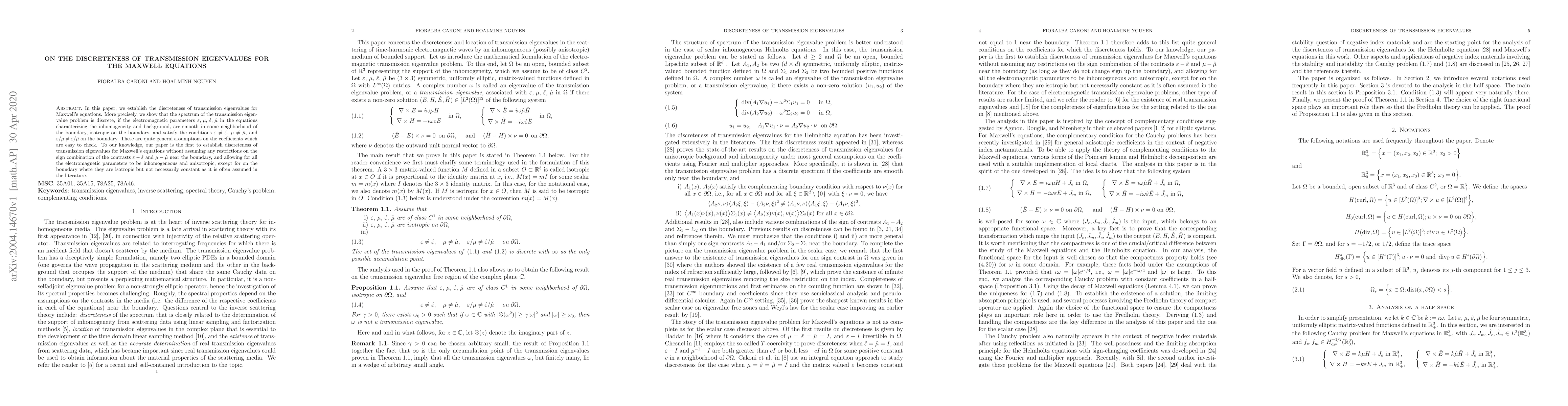 This paper establishes the discreteness of transmission eigenvalues for Maxwell's equations under general conditions, showing that the spectrum is discrete when the electromagnetic parameters are smooth near the boundary, isotropic on the boundary, and satisfy certain non-equality conditions. This is the first work to achieve this without restricting the sign combinations of the contrasts near the boundary.