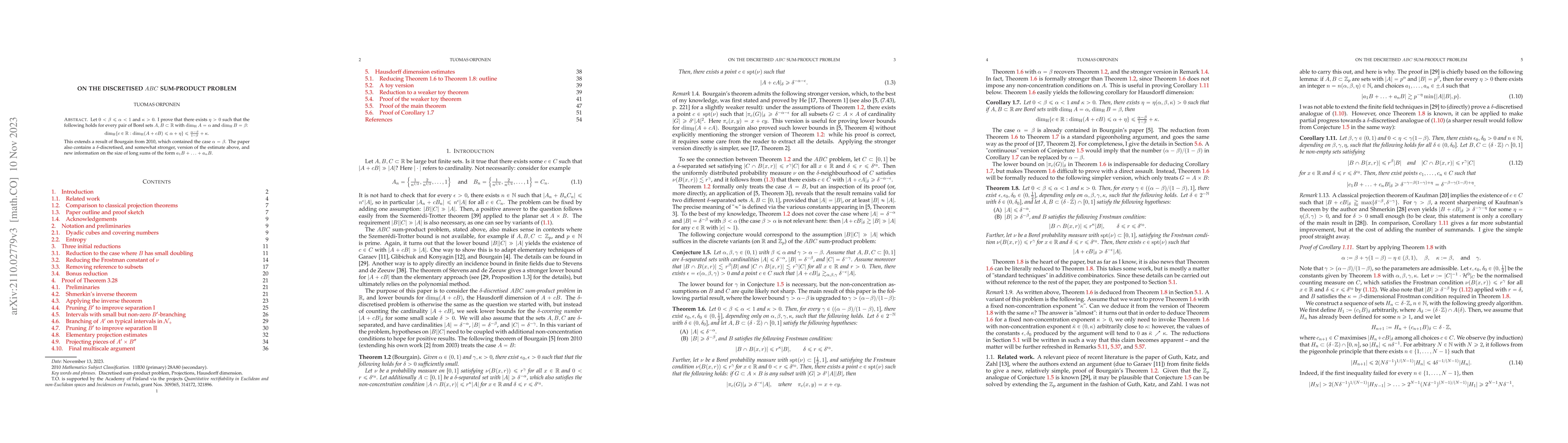This paper proves an extension of Bourgain's 2010 result on the $ABC$ sum-product problem, showing that for certain Borel sets $A$ and $B$ in $\mathbb{R}$, the Hausdorff dimension of the set where $A + cB$ has dimension $\alpha + \eta$ is bounded. It also provides a discretised version with stronger estimates and new insights on long sums of the form $a_{1}B + \ldots + a_{n}B$.