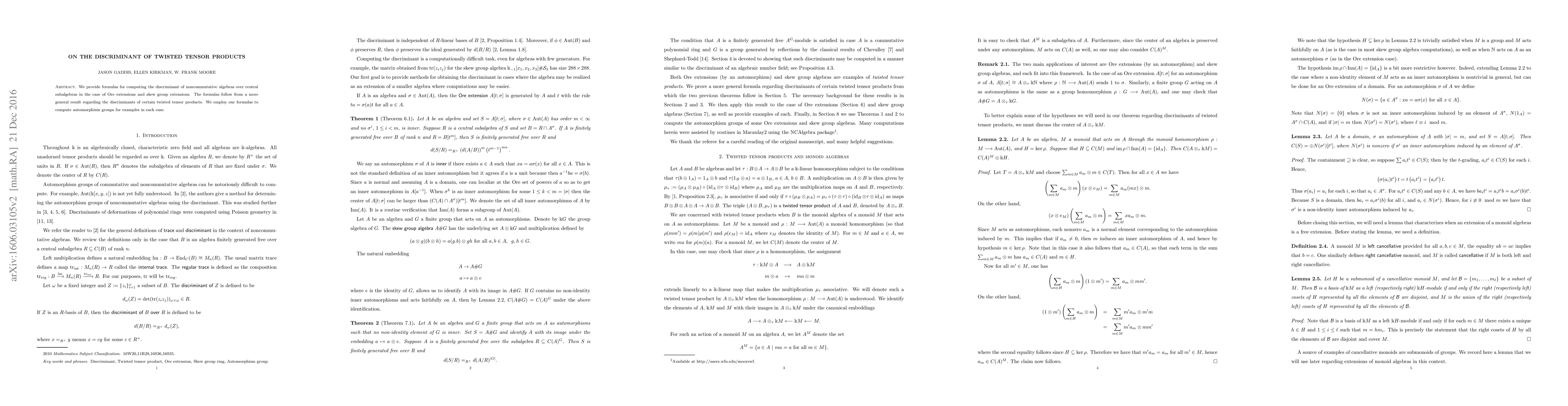 This paper derives formulas for calculating the discriminant of noncommutative algebras over central subalgebras, specifically for Ore extensions and skew group extensions. These formulas are extensions of a general result on the discriminants of twisted tensor products, and are applied to determine automorphism groups for illustrative examples.