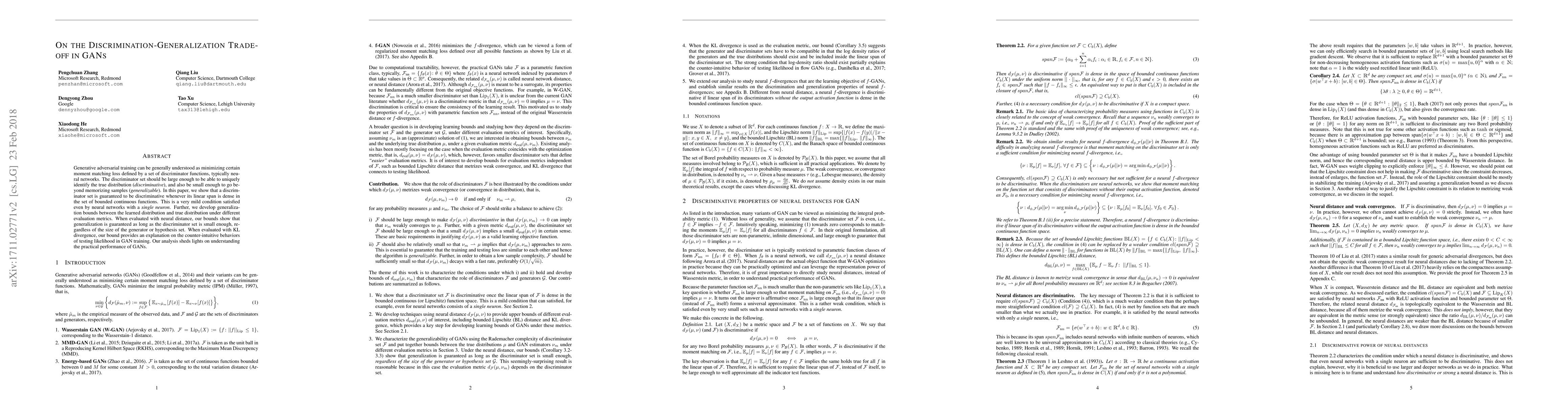 Researchers prove that a large enough discriminator set in GANs guarantees discriminative performance as long as its linear span is dense in bounded continuous functions. This helps explain the tradeoff between discrimination and generalization in GAN training.
