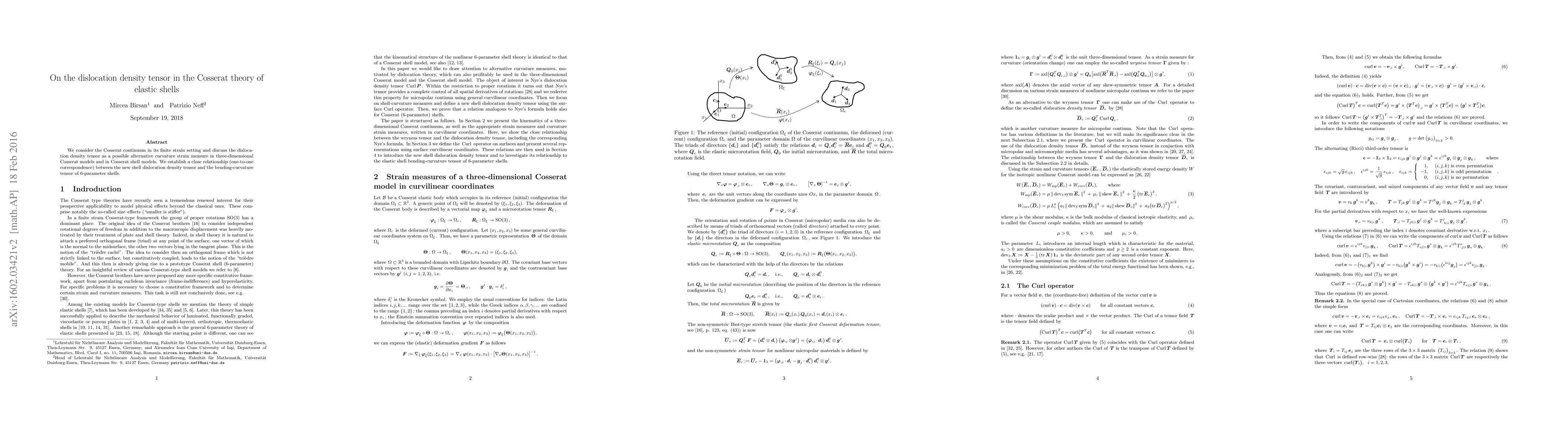 This paper explores the Cosserat continuum's finite strain framework and proposes the dislocation density tensor as an alternative curvature strain measure in three-dimensional Cosserat models and Cosserat shell models. It establishes a one-to-one correspondence between the shell dislocation density tensor and the bending-curvature tensor of 6-parameter shells.