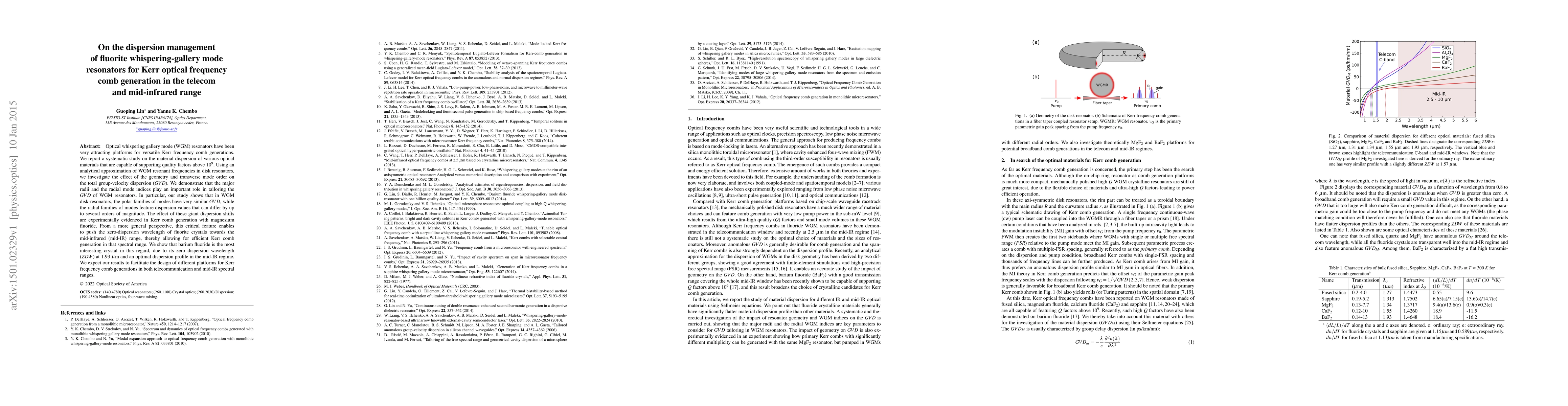Optical whispering gallery mode (WGM) resonators have been very attracting platforms for versatile Kerr frequency comb generations. We report a systematic study on the material dispersion of various optical materials that are capable of supporting quality factors above $10^9$. Using an analytical approximation of WGM resonant frequencies in disk resonators, we investigate the effect of the geometry and transverse mode order on the total group-velocity dispersion ($GVD$). We demonstrate that the major radii and the radial mode indices play an important role in tailoring the $GVD$ of WGM resonators. In particular, our study shows that in WGM disk-resonators, the polar families of modes have very similar $GVD$, while the radial families of modes feature dispersion values that can differ by up to several orders of magnitude. The effect of these giant dispersion shifts are experimentally evidenced in Kerr comb generation with magnesium fluoride. From a more general perspective, this critical feature enables to push the zero-dispersion wavelength of fluorite crystals towards the mid-infrared (mid-IR) range, thereby allowing for efficient Kerr comb generation in that spectral range. We show that barium fluoride is the most interesting crystal in this regard, due to its zero dispersion wavelength ($ZDW$) at $1.93 \rm{\mu m}$ and an optimal dispersion profile in the mid-IR regime. We expect our results to facilitate the design of different platforms for Kerr frequency comb generations in both telecommunication and mid-IR spectral ranges.
