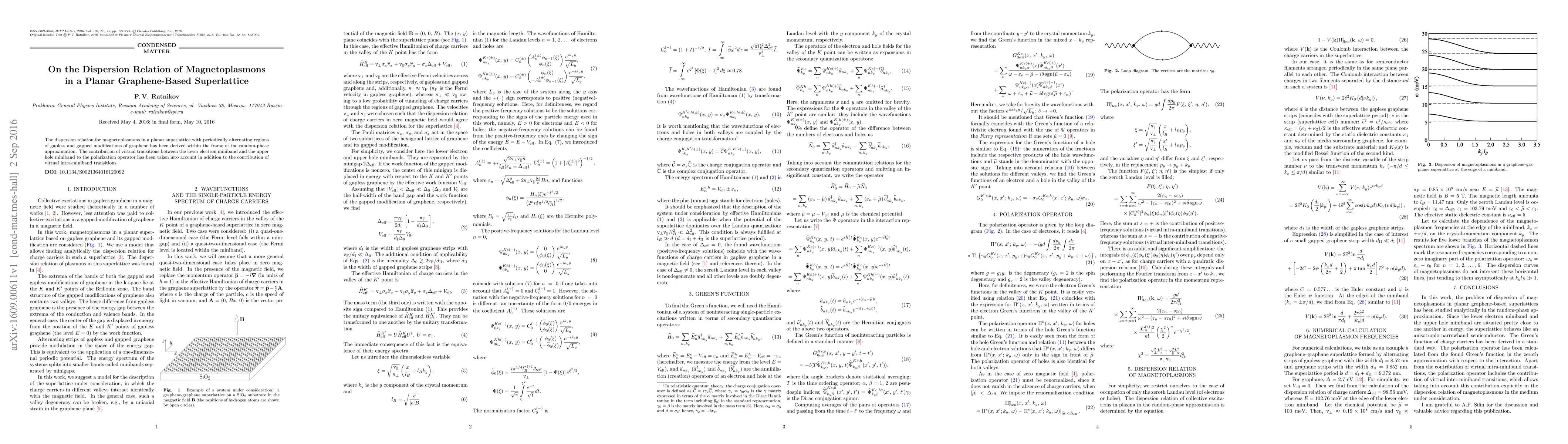 The dispersion relation for magnetoplasmons in a planar superlattice with periodically alternating regions of gapless and gapped modications of graphene has been derived within the frame of the random-phase approximation. The contribution of virtual transitions between the lower electron miniband and the upper hole miniband to the polarization operator has been taken into account in addition to the contribution of virtual intra-miniband transitions.