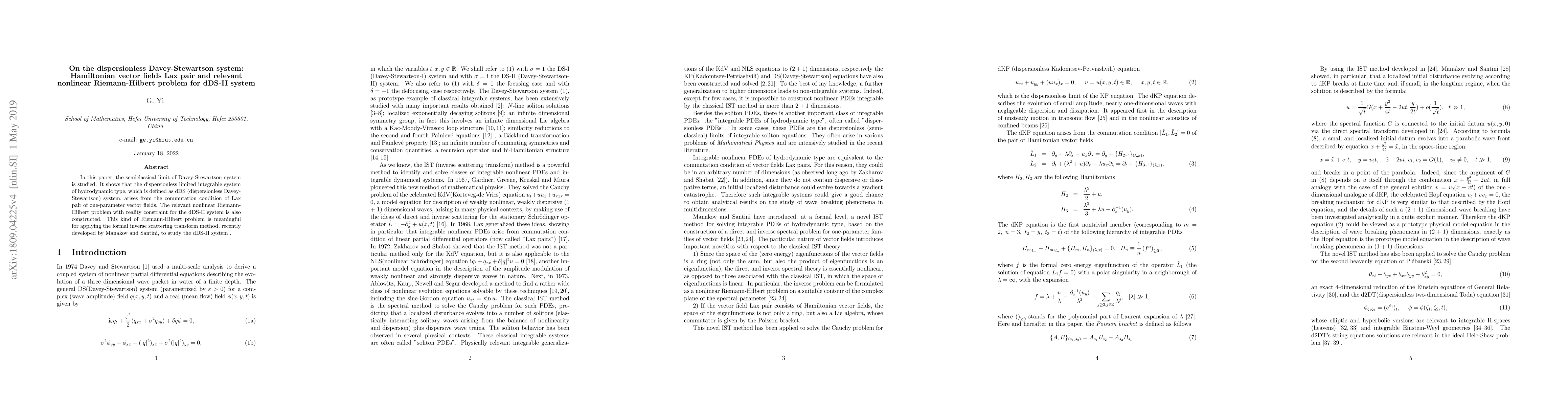 In this paper, the semiclassical limit of Davey-Stewartson systems are studied. It shows that these dispersionless limited integrable systems of hydrodynamic type, which are defined as dDS (dispersionless Davey-Stewartson) systems, are arisen from the commutation condition of Lax pairs of one-parameter vector fields. The relevant nonlinear Riemann-Hilbert problems with some symmetries for the dDS-II system are also constructed. This kind of Riemann-Hilbert problems are meaningful for applying the formal inverse scattering transform method, recently developed by Manakov and Santini, to study the dDS-II system .