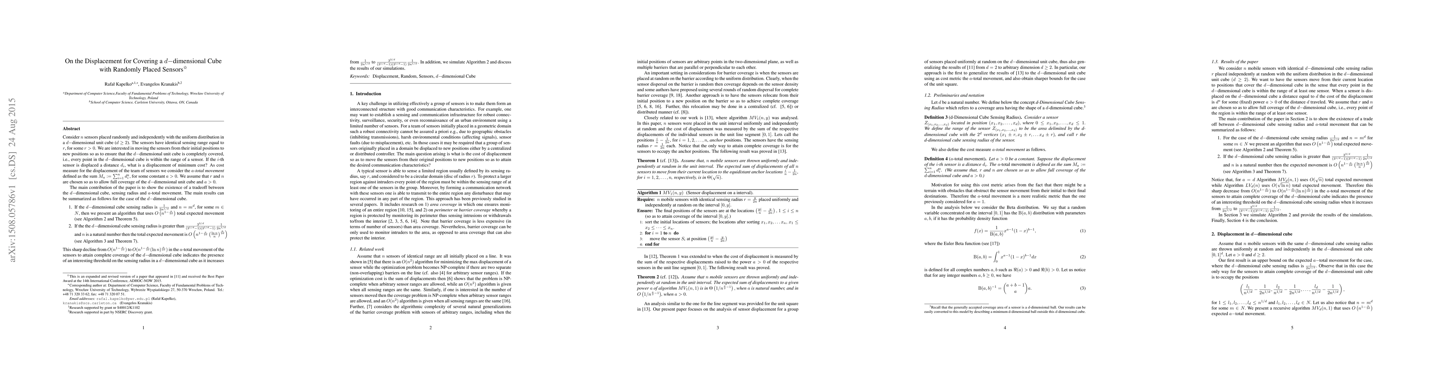 Consider $n$ sensors placed randomly and independently with the uniform distribution in a $d-$dimensional unit cube ($d\ge 2$). The sensors have identical sensing range equal to $r$, for some $r >0$. We are interested in moving the sensors from their initial positions to new positions so as to ensure that the $d-$dimensional unit cube is completely covered, i.e., every point in the $d-$dimensional cube is within the range of a sensor. If the $i$-th sensor is displaced a distance $d_i$, what is a displacement of minimum cost? As cost measure for the displacement of the team of sensors we consider the $a$-total movement defined as the sum $M_a:= \sum_{i=1}^n d_i^a$, for some constant $a>0$. We assume that $r$ and $n$ are chosen so as to allow full coverage of the $d-$dimensional unit cube and $a > 0$. The main contribution of the paper is to show the existence of a tradeoff between the $d-$dimensional cube, sensing radius and $a$-total movement. The main results can be summarized as follows for the case of the $d-$dimensional cube. If the $d-$dimensional cube sensing radius is $\frac{1}{2n^{1/d}}$ and $n=m^d$, for some $m\in N$, then we present an algorithm that uses $O\left(n^{1-\frac{a}{2d}}\right)$ total expected movement (see Algorithm 2 and Theorem 5). If the $d-$dimensional cube sensing radius is greater than $\frac{3^{3/d}}{(3^{1/d}-1)(3^{1/d}-1)}\frac{1}{2n^{1/d}}$ and $n$ is a natural number then the total expected movement is $O\left(n^{1-\frac{a}{2d}}\left(\frac{\ln n}{n}\right)^{\frac{a}{2d}}\right)$ (see Algorithm 3 and Theorem 7). In addition, we simulate Algorithm 2 and discuss the results of our simulations.