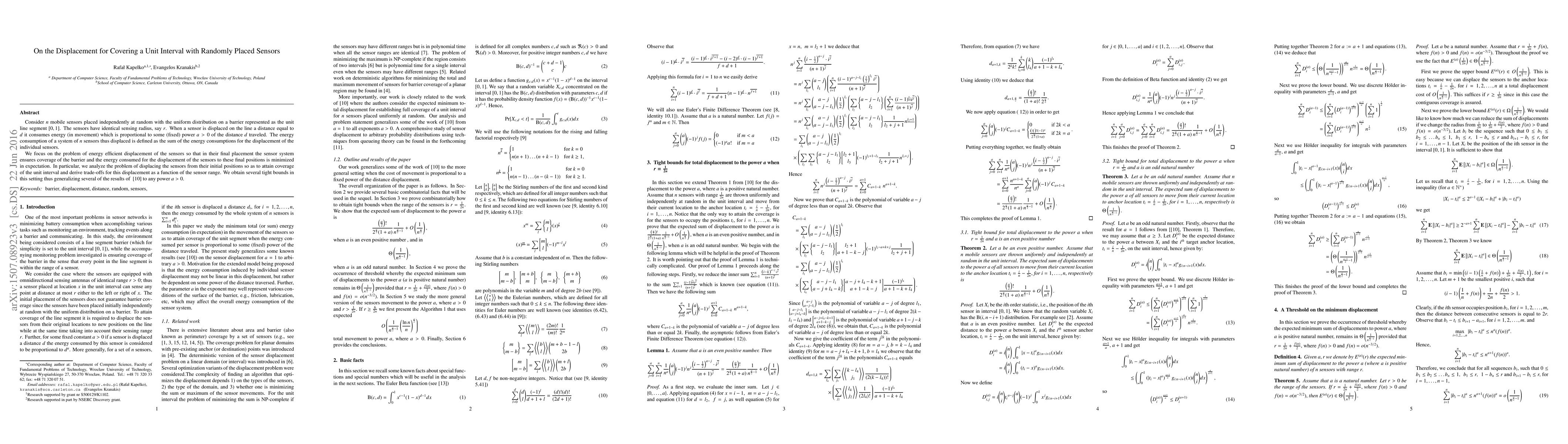 Researchers analyzed the energy-efficient displacement of sensors to cover a unit interval with minimal energy consumption, deriving tight bounds for different sensor ranges.