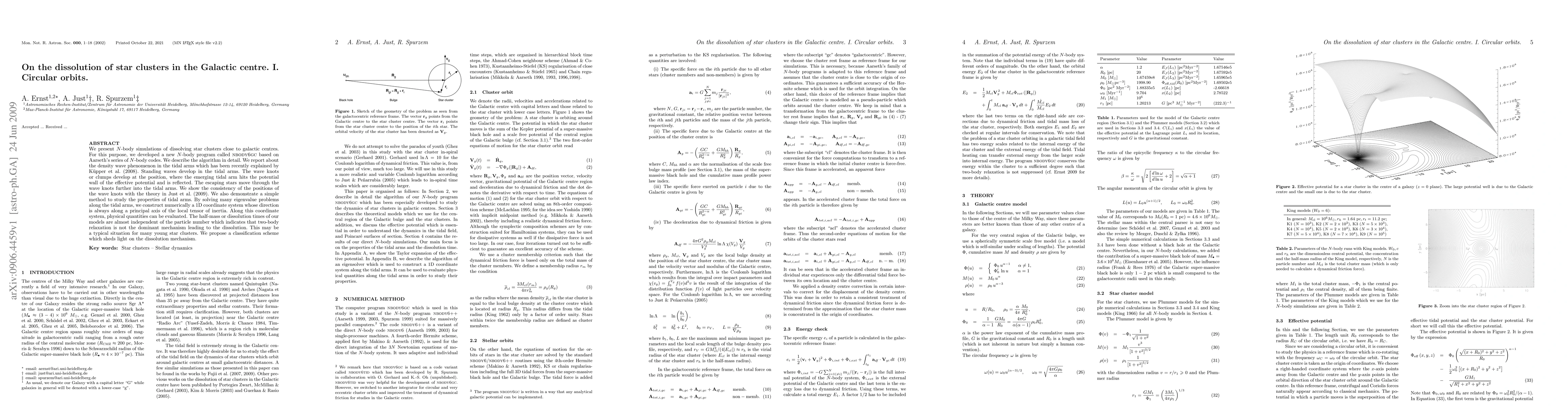 This paper presents N-body simulations using the new nbody6gc program to study the dissolution of star clusters near galactic centers, revealing the development of density waves and standing waves in tidal arms. The findings suggest that two-body relaxation is not the primary dissolution mechanism, proposing a classification scheme for understanding the dissolution process.
