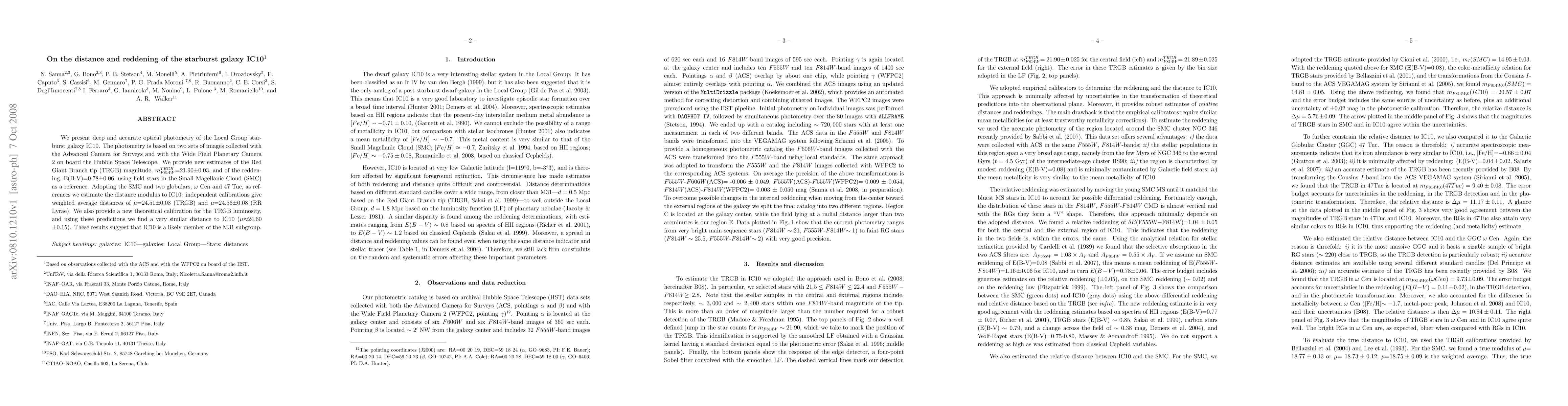This paper presents new optical photometry of the starburst galaxy IC10, estimating its distance using the Red Giant Branch tip and RR Lyrae stars, and finds a distance modulus of approximately 24.51+-0.08, suggesting IC10 is likely part of the M31 subgroup. The study also provides new estimates for the galaxy's reddening, E(B-V)=0.78+-0.06.
