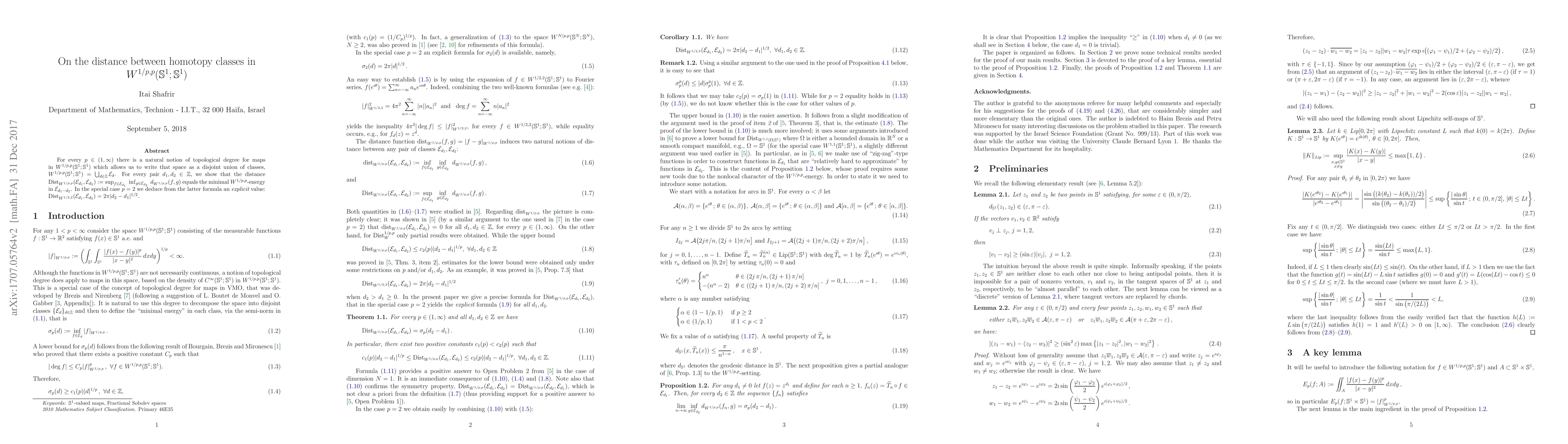 For every $p\in(1,\infty)$ there is a natural notion of topological degree for maps in $W^{1/p,p}({\mathbb S}^1;{\mathbb S}^1)$ which allows us to write that space as a disjoint union of classes, $W^{1/p,p}({\mathbb S}^1;{\mathbb S}^1)=\bigcup_{d\in{\mathbb Z}}\mathcal{E}_d$. For every pair $d_1,d_2\in {\mathbb Z}$, we show that the distance $\text{Dist}_{W^{1/p,p}}({\mathcal E}_{d_1}, {\mathcal E}_{d_2}):=\sup_{f\in{\mathcal E}_{d_1}}\ \inf_{g\in{\mathcal E}_{d_2}}\ d_{W^{1/p,p}}(f, g)$ equals the minimal $W^{1/p,p}$-energy in $\mathcal{E}_{d_1-d_2}$. In the special case $p=2$ we deduce from the latter formula an explicit value: $\text{Dist}_{W^{1/2,2}}({\mathcal E}_{d_1}, {\mathcal E}_{d_2})=2\pi|d_2-d_1|^{1/2}$.