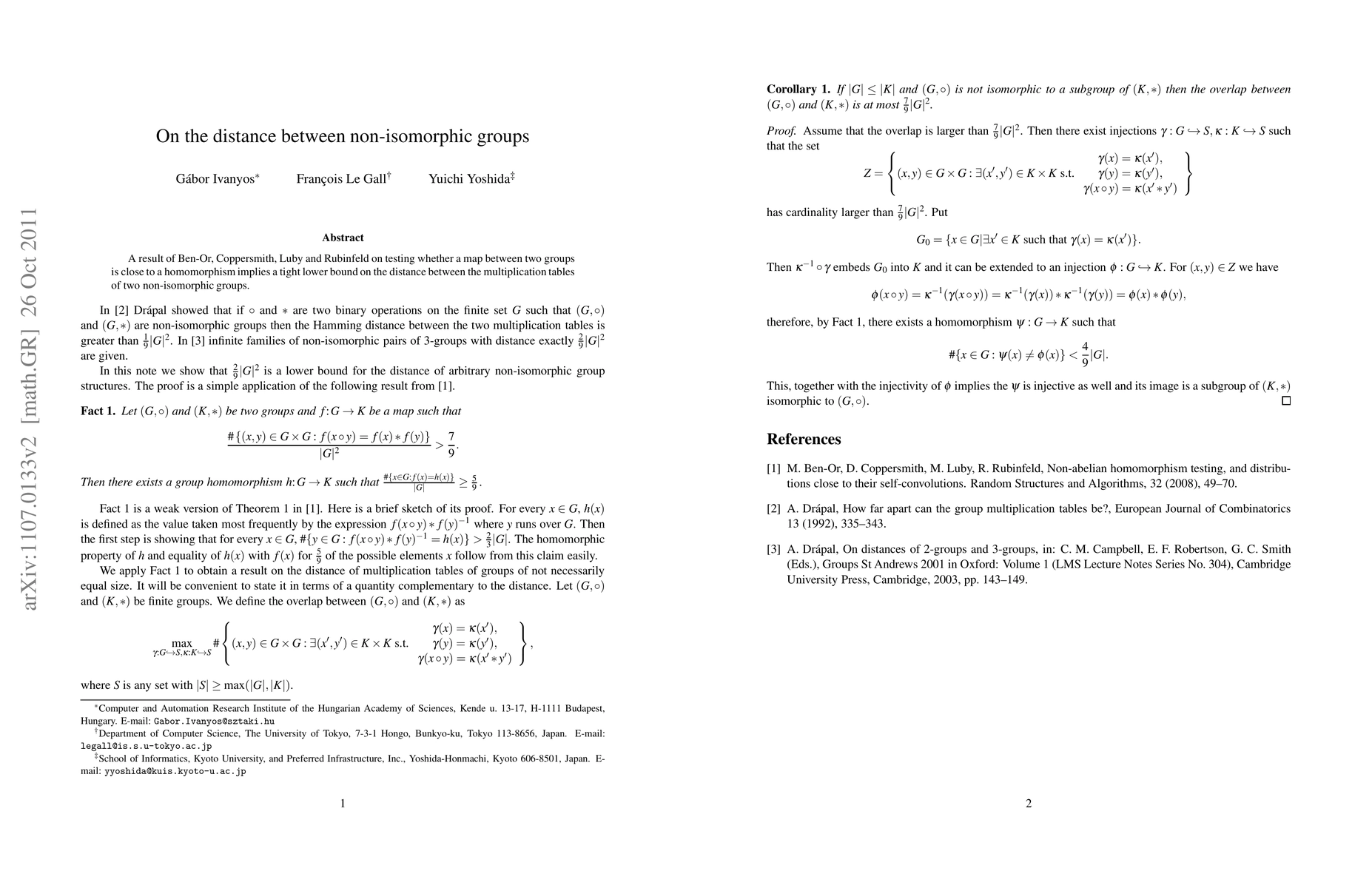A result of Ben-Or, Coppersmith, Luby and Rubinfeld on testing whether a map be two groups is close to a homomorphism implies a tight lower bound on the distance between the multiplication tables of two non-isomorphic groups.