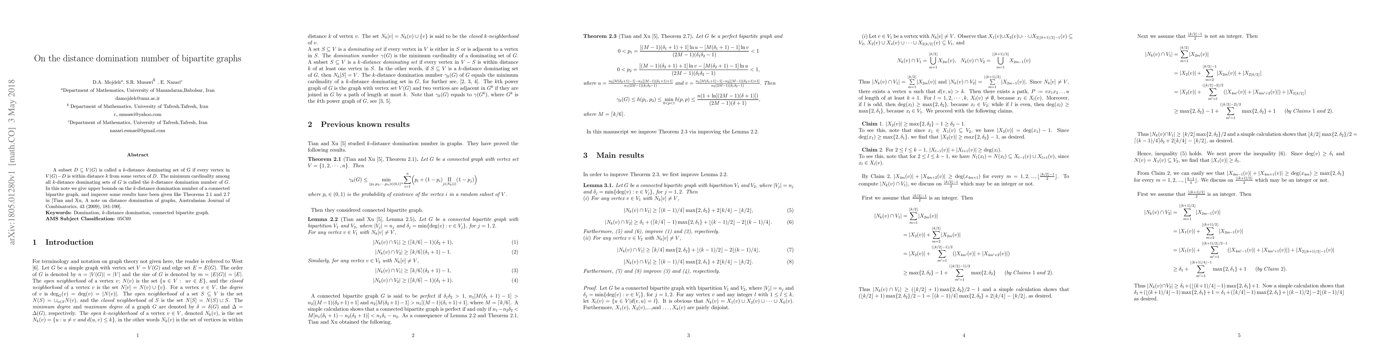 A subset $D\subseteq V(G)$ is called a $k$-distance dominating set of $G$ if every vertex in $V(G)\setminus D$ is within distance $k$ from some vertex of $D$. The minimum cardinality among all $k$-distance dominating sets of $G$ is called the $k$-distance domination number of $G$. In this note we give upper bound on the $k$-distance domination number of a connected bipartite graph and improve some results have been given like Theorem 2.1 and 2,7 in [Tian and Xu, A note on distance domination of graphs, Australian Journal of Combinatorics, 43 (2009), 181-190].
