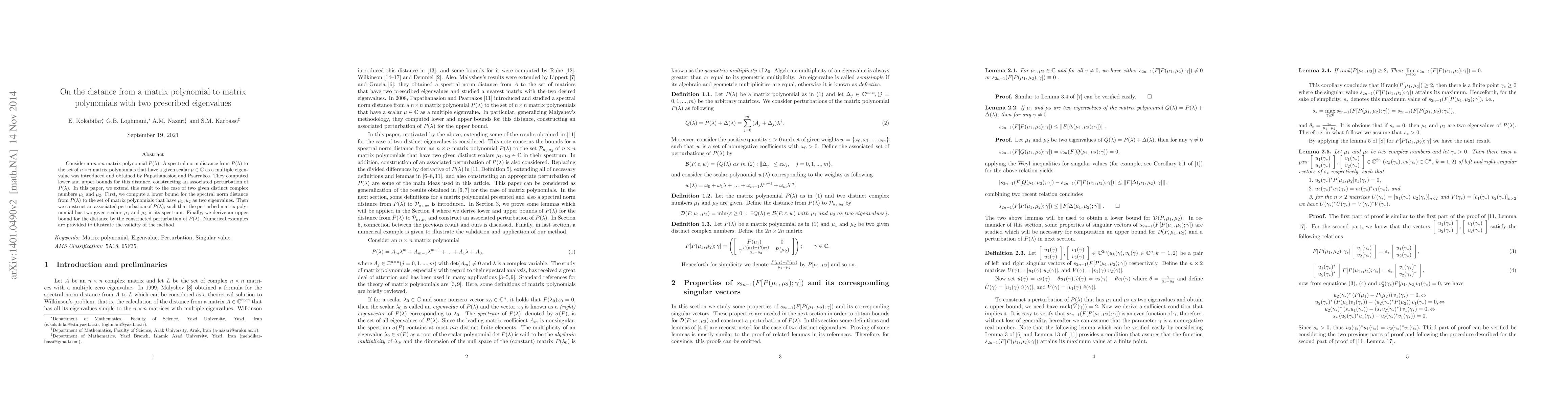 This paper extends the distance computation from a matrix polynomial to those with two prescribed eigenvalues, deriving lower and upper bounds for the spectral norm distance. It constructs a perturbation of the original polynomial to achieve the desired eigenvalues and provides numerical examples for validation.