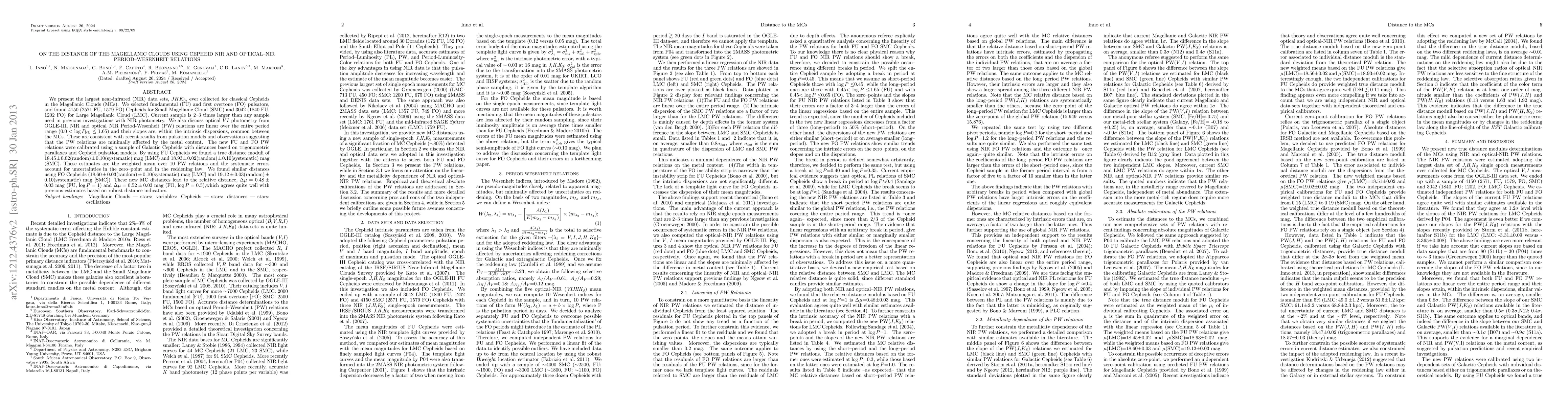 We present the largest near-infrared (NIR) data sets, $JHKs$, ever collected for classical Cepheids in the Magellanic Clouds (MCs). We selected fundamental (FU) and first overtone (FO) pulsators, and found 4150 (2571 FU, 1579 FO) Cepheids for Small Magellanic Cloud (SMC) and 3042 (1840 FU, 1202 FO) for Large Magellanic Cloud (LMC). Current sample is 2--3 times larger than any sample used in previous investigations with NIR photometry. We also discuss optical $VI$ photometry from OGLE-III. NIR and optical--NIR Period-Wesenheit (PW) relations are linear over the entire period range ($0.0<\log P_{\rm FU} \le1.65 $) and their slopes are, within the intrinsic dispersions, common between the MCs. These are consistent with recent results from pulsation models and observations suggesting that the PW relations are minimally affected by the metal content. The new FU and FO PW relations were calibrated using a sample of Galactic Cepheids with distances based on trigonometric parallaxes and Cepheid pulsation models. By using FU Cepheids we found a true distance moduli of $18.45\pm0.02{\rm(random)}\pm0.10{\rm(systematic)}$ mag (LMC) and $18.93\pm0.02{\rm(random)}\pm0.10{\rm(systematic)}$ mag (SMC). These estimates are the weighted mean over ten PW relations and the systematic errors account for uncertainties in the zero-point and in the reddening law. We found similar distances using FO Cepheids ($18.60\pm0.03{\rm(random)}\pm0.10{\rm(systematic)}$ mag [LMC] and $19.12\pm0.03{\rm(random)}\pm0.10{\rm(systematic)}$ mag [SMC]). These new MC distances lead to the relative distance, $\Delta\mu=0.48\pm0.03$ mag (FU, $\log P=1$) and $\Delta\mu=0.52\pm0.03$ mag (FO, $\log P=0.5$),which agrees quite well with previous estimates based on robust distance indicators.