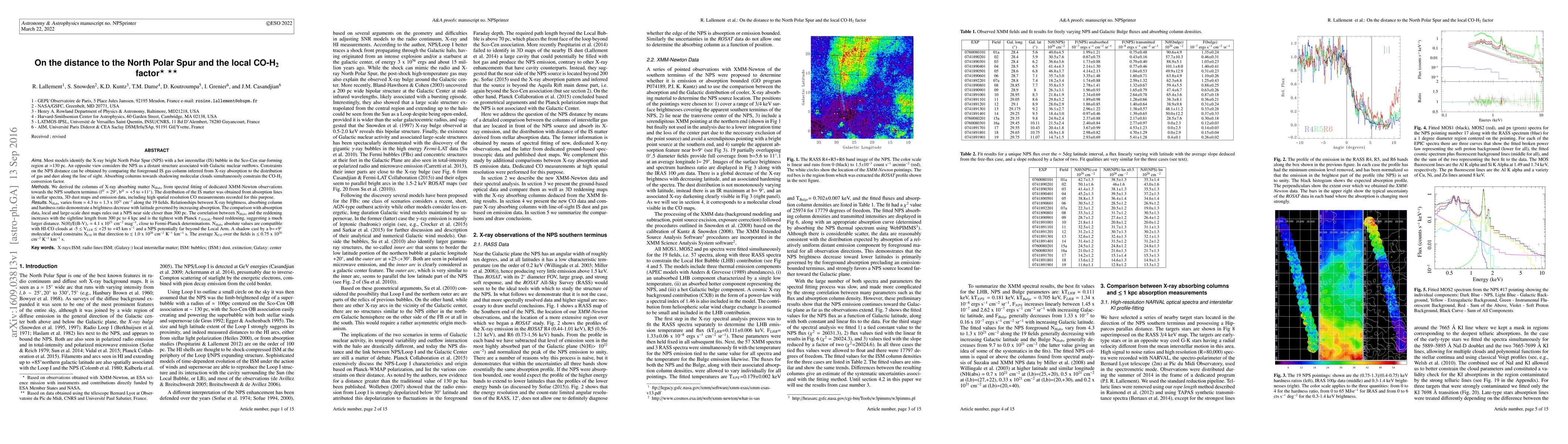 Most models identify the X-ray bright North Polar Spur (NPS) with a hot interstellar (IS) bubble in the Sco-Cen star-forming region at $\simeq$130 pc. An opposite view considers the NPS as a distant structure associated with Galactic nuclear outflows. Constraints on the NPS distance can be obtained by comparing the foreground IS gas column inferred from X-ray absorption to the distribution of gas and dust along the line of sight. Absorbing columns towards shadowing molecular clouds simultaneously constrain the CO-H$_{2}$ conversion factor. We derived the columns of X-ray absorbing matter NH(abs) from spectral fitting of dedicated XMM-Newton observations towards the NPS southern terminus (l=29{\deg}, b=+5 to +11{\deg}). The IS matter distribution was obtained from absorption lines in stellar spectra, 3D dust maps and emission data, including high spatial resolution CO measurements recorded for this purpose. NH(abs) varies from $\simeq$ 4.3 to $\simeq$ 1.3 x 10$^{21}$ cm$^{-2}$ along the 19 fields. Relationships between X-ray brightness, absorbing column and hardness ratio demonstrate a brightness decrease with latitude governed by increasing absorption. The comparison with absorption data, local and large-scale dust maps rules out a NPS near side closer than 300 pc. The correlation between NH(abs) and the reddening increases with the sightline length from 300 pc to 4 kpc and is the tightest with Planck $\tau_{353}$-based reddening, suggesting a much larger distance. N(H)/E(B-V) $\simeq$ 4.1 x 10$^{21}$ cm$^{-2}$ mag$^{-1}$. NH(abs) absolute values are compatible with HI-CO clouds at -5 $\leq$ V(LSR) $\leq$ +25 to +45 km s$^{-1}$ and a NPS potentially far beyond the Local Arm. A molecular cloud shadow at b=+9deg constrains X$_{CO}$ to $\leq$ 1.0 x 10$^{20}$ cm$^{-2}$ K$^{-1}$ km$^{-1}$ s. The average X$_{CO}$ is $\leq$ 0.75 x 10$^{20}$ cm$^{-2}$ K$^{-1}$ km$^{-1}$ s.