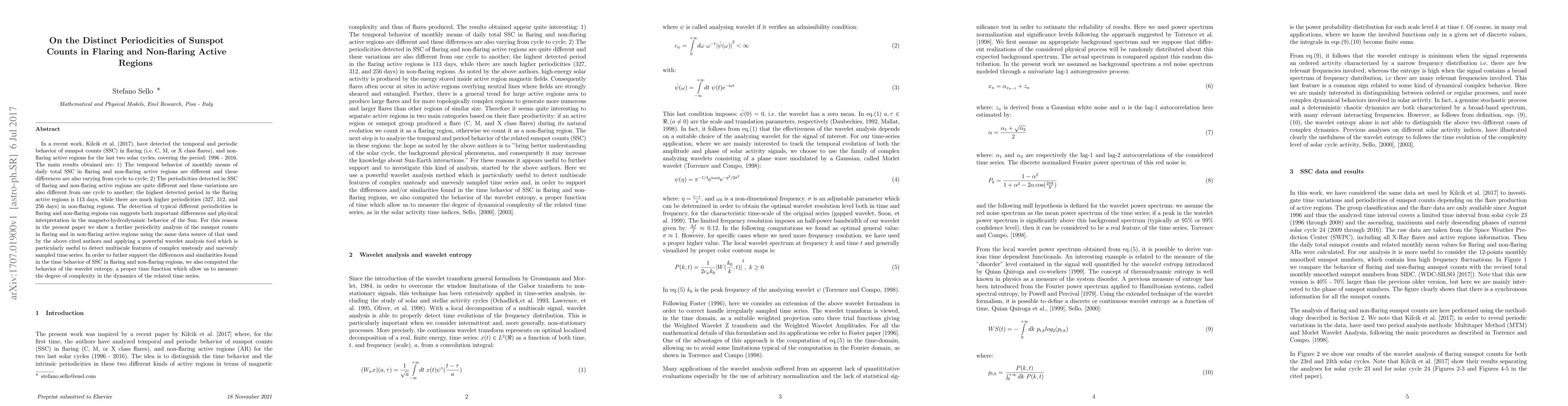 In a recent work, Kilcik et al. (2017), have detected the temporal and periodic behavior of sunspot counts (SSC) in flaring (i.e. C, M, or X class flares), and non-flaring active regions for the last two solar cycles, covering the period: 1996 - 2016. The main results obtained are: 1) The temporal behavior of monthly means of daily total SSC in flaring and non-flaring active regions are different and these differences are also varying from cycle to cycle; 2) The periodicities detected in SSC of flaring and non-flaring active regions are quite different and these variations are also different from one cycle to another; the highest detected period in the flaring active regions is 113 days, while there are much higher periodicities (327, 312, and 256 days) in non-flaring regions. The detection of typical different periodicities in flaring and non-flaring regions can suggests both important differences and physical interpretation in the magneto-hydrodynamic behavior of the Sun. For this reason in the present paper we show a further periodicity analysis of the sunspot counts in flaring and in non-flaring active regions using the same data source of that used by the above cited authors and applying a powerful wavelet analysis tool which is particularly useful to detect multiscale features of complex unsteady and unevenly sampled time series. In order to futher support the differences and similarities found in the time behavior of SSC in flaring and non-flaring regions, we also computed the behavior of the wavelet entropy, a proper time function which allow us to measure the degree of complexity in the dynamics of the related time series.