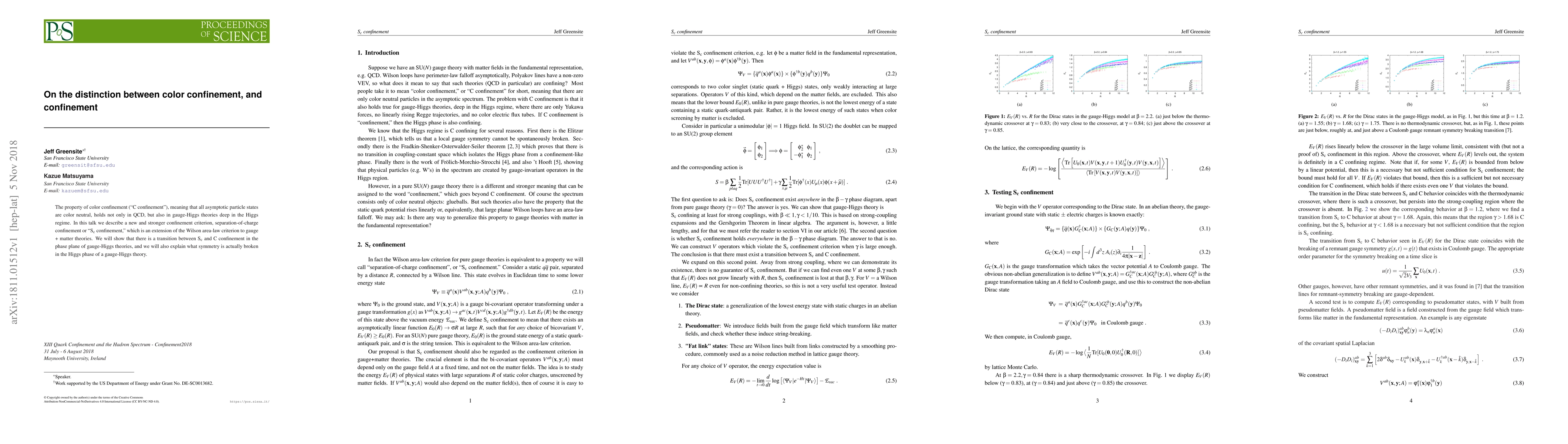 The property of color confinement ("C confinement"), meaning that all asymptotic particle states are color neutral, holds not only in QCD, but also in gauge-Higgs theories deep in the Higgs regime. In this talk we describe a new and stronger confinement criterion, separation-of-charge confinement or "S$_c$ confinement," which is an extension of the Wilson area-law criterion to gauge + matter theories. We will show that there is a transition between S$_c$ and C confinement in the phase plane of gauge-Higgs theories, and we will also explain what symmetry is actually broken in the Higgs phase of a gauge-Higgs theory.