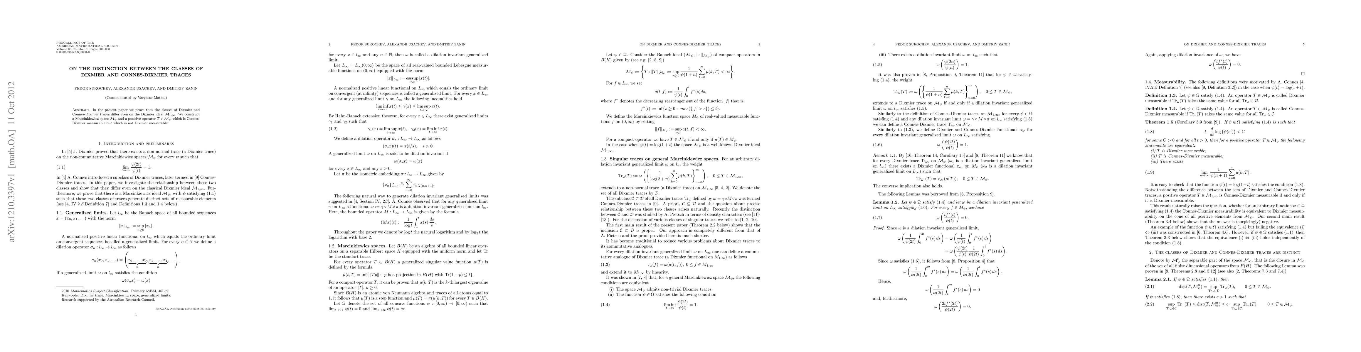 This paper demonstrates that the classes of Dixmier and Connes-Dixmier traces are distinct, even within the Dixmier ideal $\mathcal M_{1,\infty}$. It constructs a Marcinkiewicz space $\mathcal M_\psi$ and a positive operator $T$ that is Connes-Dixmier measurable but not Dixmier measurable.