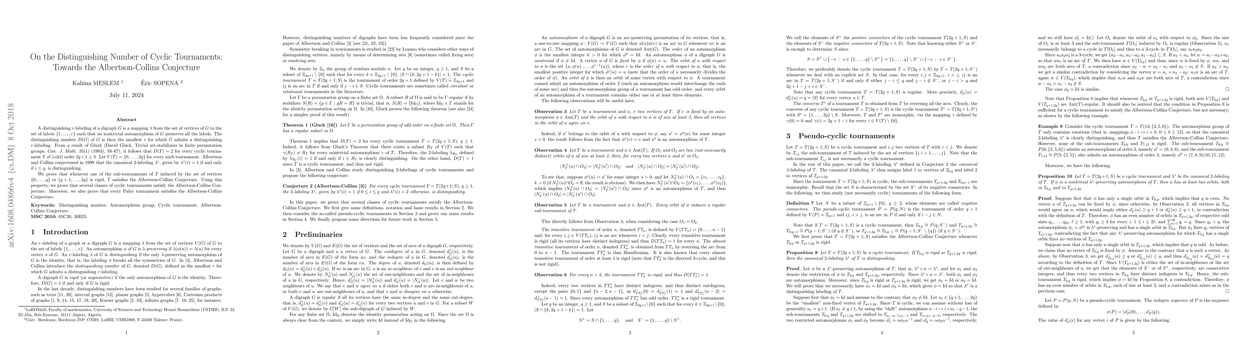 A distinguishing $r$-labeling of a digraph $G$ is a mapping $\lambda$ from the set of verticesof $G$ to the set of labels $\{1,\dots,r\}$ such that no nontrivial automorphism of $G$ preserves all the labels.The distinguishing number $D(G)$ of $G$ is then the smallest $r$ for which $G$ admits a distinguishing $r$-labeling.From a result of Gluck (David Gluck, Trivial set-stabilizers in finite permutation groups,{\em Can. J. Math.} 35(1) (1983), 59--67),it follows that $D(T)=2$ for every cyclic tournament~$T$ of (odd) order $2q+1\ge 3$.Let $V(T)=\{0,\dots,2q\}$ for every such tournament.Albertson and Collins conjectured in 1999that the canonical 2-labeling $\lambda^*$ given by$\lambda^*(i)=1$ if and only if $i\le q$ is distinguishing.We prove that whenever one of the subtournaments of $T$ induced by vertices $\{0,\dots,q\}$or $\{q+1,\dots,2q\}$ is rigid, $T$ satisfies Albertson-Collins Conjecture.Using this property, we prove that several classes of cyclic tournaments satisfy Albertson-Collins Conjecture.Moreover, we also prove that every Paley tournament satisfies Albertson-Collins Conjecture.
