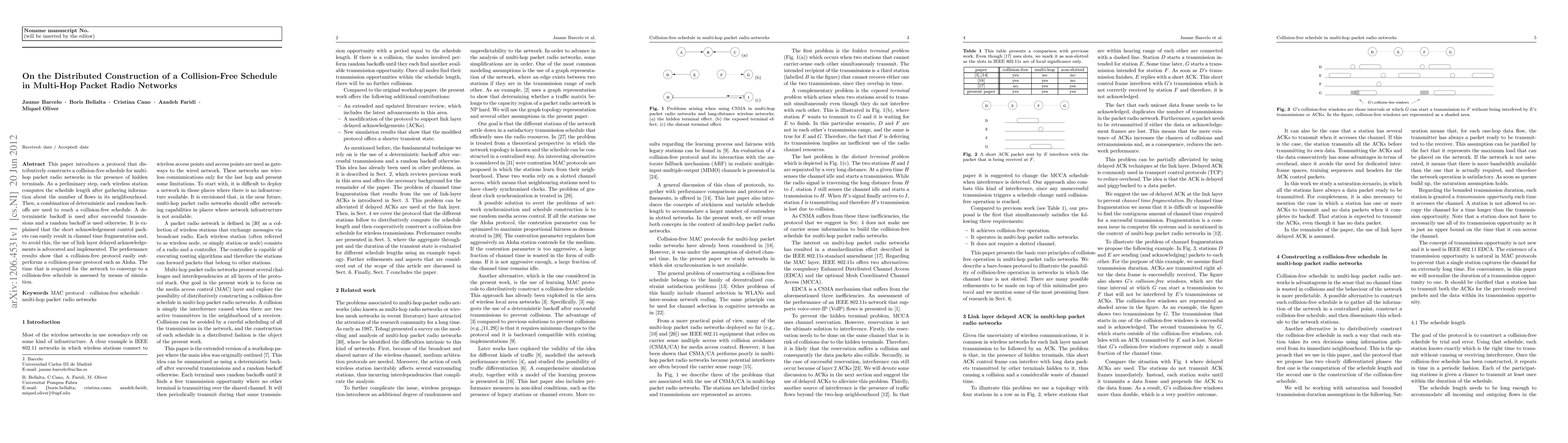 This paper proposes a distributed protocol for creating a collision-free schedule in multi-hop packet radio networks, using a mix of deterministic and random backoffs to avoid collisions, especially in the presence of hidden terminals. Simulation results demonstrate superior performance over collision-prone protocols like Aloha.