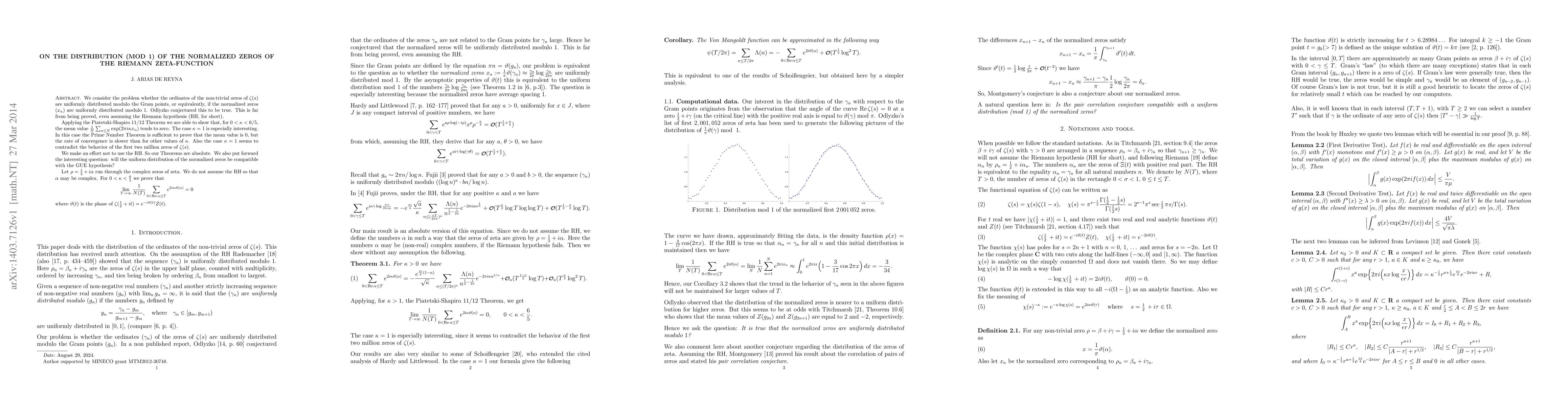 We consider the problem whether the ordinates of the non-trivial zeros of $\zeta(s)$ are uniformly distributed modulo the Gram points, or equivalently, if the normalized zeros $(x_n)$ are uniformly distributed modulo 1. Odlyzko conjectured this to be true. This is far from being proved, even assuming the Riemann hypothesis (RH, for short). Applying the Piatetski-Shapiro $11/12$ Theorem we are able to show that, for $0<\kappa<6/5$, the mean value $\frac1N\sum_{n\le N}\exp(2\pi i \kappa x_n)$ tends to zero. The case $\kappa=1$ is especially interesting. In this case the Prime Number Theorem is sufficient to prove that the mean value is $0$, but the rate of convergence is slower than for other values of $\kappa$. Also the case $\kappa=1$ seems to contradict the behavior of the first two million zeros of $\zeta(s)$. We make an effort not to use the RH. So our Theorems are absolute. We also put forward the interesting question: will the uniform distribution of the normalized zeros be compatible with the GUE hypothesis? Let $\rho=\frac12+i\alpha$ run through the complex zeros of zeta. We do not assume the RH so that $\alpha$ may be complex. For $0<\kappa<\frac65$ we prove that \[\lim_{T\to\infty}\frac{1}{N(T)}\sum_{0<\Re\alpha\le T}e^{2i\kappa\vartheta(\alpha)}=0\] where $\vartheta(t)$ is the phase of $\zeta(\frac12+it)=e^{-i\vartheta(t)}Z(t)$.