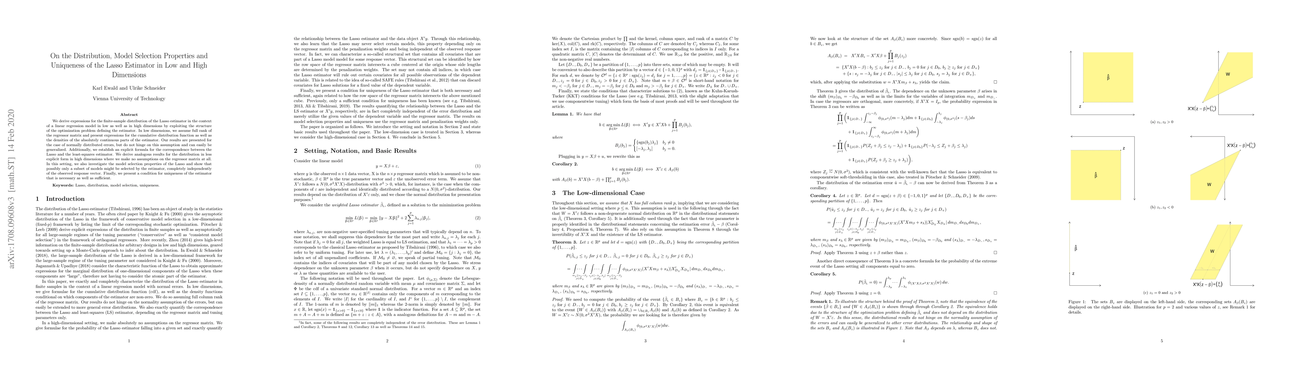This paper derives expressions for the finite-sample distribution of the Lasso estimator in linear regression models, both in low and high dimensions, and establishes conditions for its uniqueness. It also investigates the model selection properties of the Lasso in high-dimensional settings.