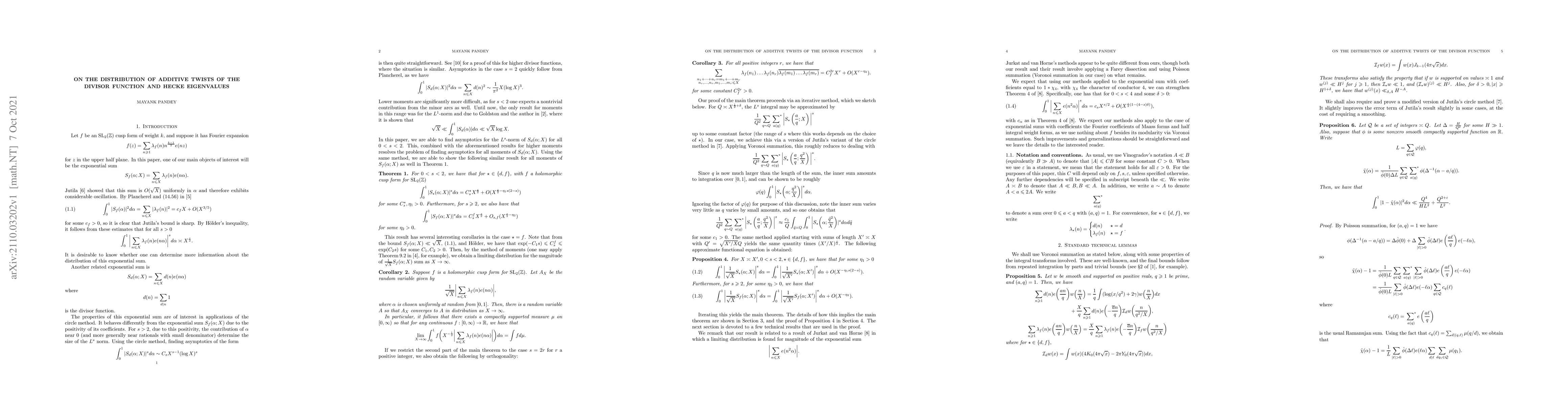 We obtain asymptotics with a power saving error term for $\int_0^1|\sum_{n\le X} d(n)e(n\alpha)|^sd\alpha$ for $s < 2$, where $d(n) = \sum_{d | n} 1$ is the divisor function. We also obtain such asymptotics for $\int_0^1|\sum_{n\le X}\lambda_f(n)e(n\alpha)|^sd\alpha$ for all $s > 0$. Our proof an iterative method with repeated applications of Jutila's variant of the circle method and Voronoi summation.