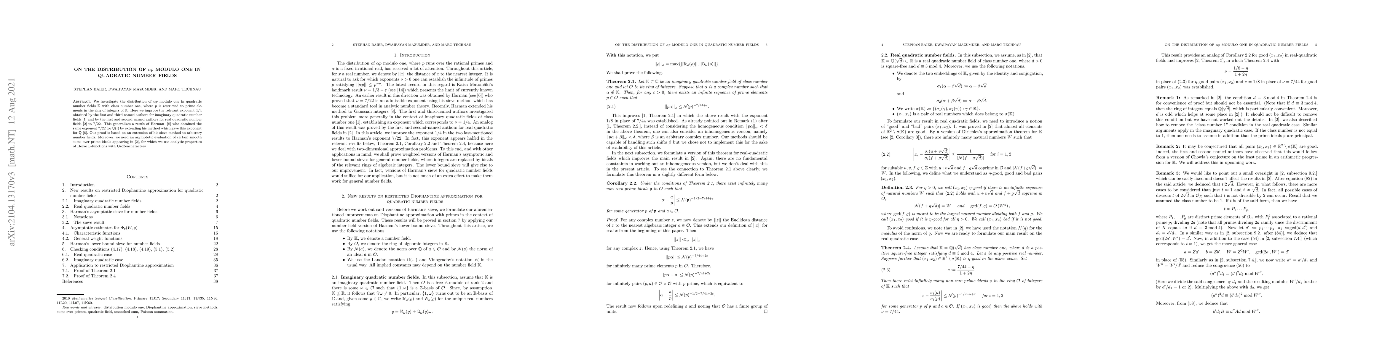 This paper improves the exponent for the distribution of $\alpha p$ modulo one in quadratic number fields with class number one, generalizing Harman's result for $\mathbb{Q}(i)$ to all such fields, using an extended sieve method and analytic properties of Hecke L-functions.
