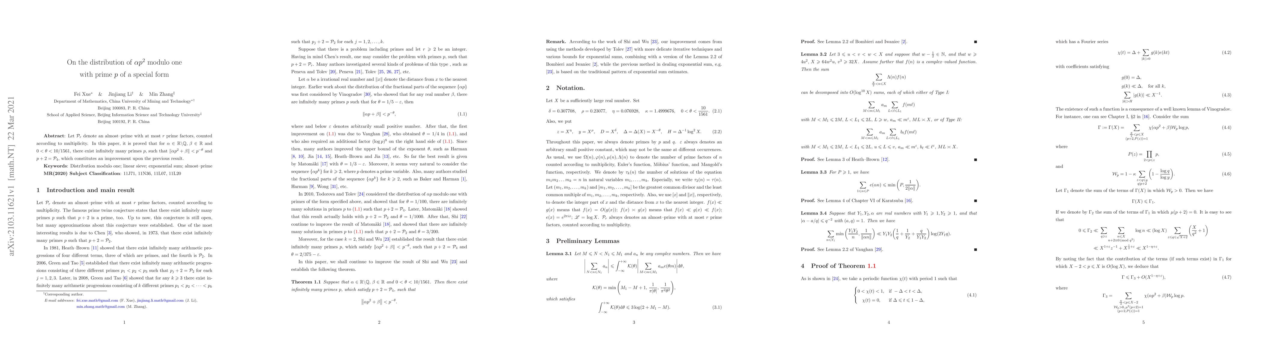 Let $\mathcal{P}_r$ denote an almost-prime with at most $r$ prime factors, counted according to multiplicity. In this paper, it is proved that for $\alpha\in\mathbb{R}\backslash\mathbb{Q},\,\beta\in\mathbb{R}$ and $0<\theta<10/1561$, there exist infinitely many primes $p$, such that $\|\alpha p^2+\beta\|
