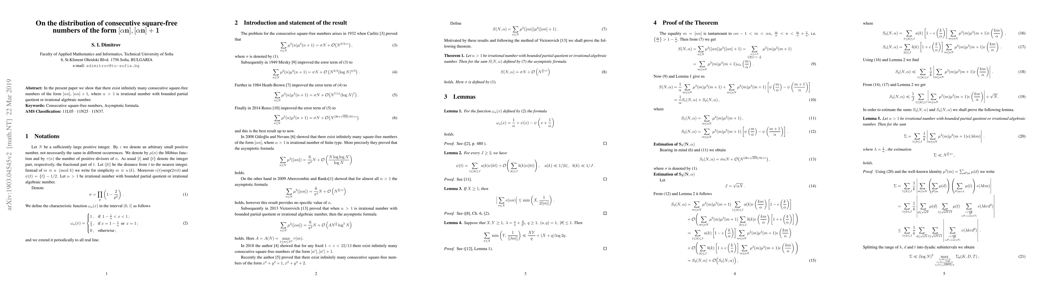 This paper shows that there are infinitely many consecutive pairs of square-free numbers in a specific sequence, where one number is of the form $[rac{ ext{irrational}}{n}]$ or $[rac{ ext{irrational}}{n}]+1$. This implies that such sequences cannot be finite.